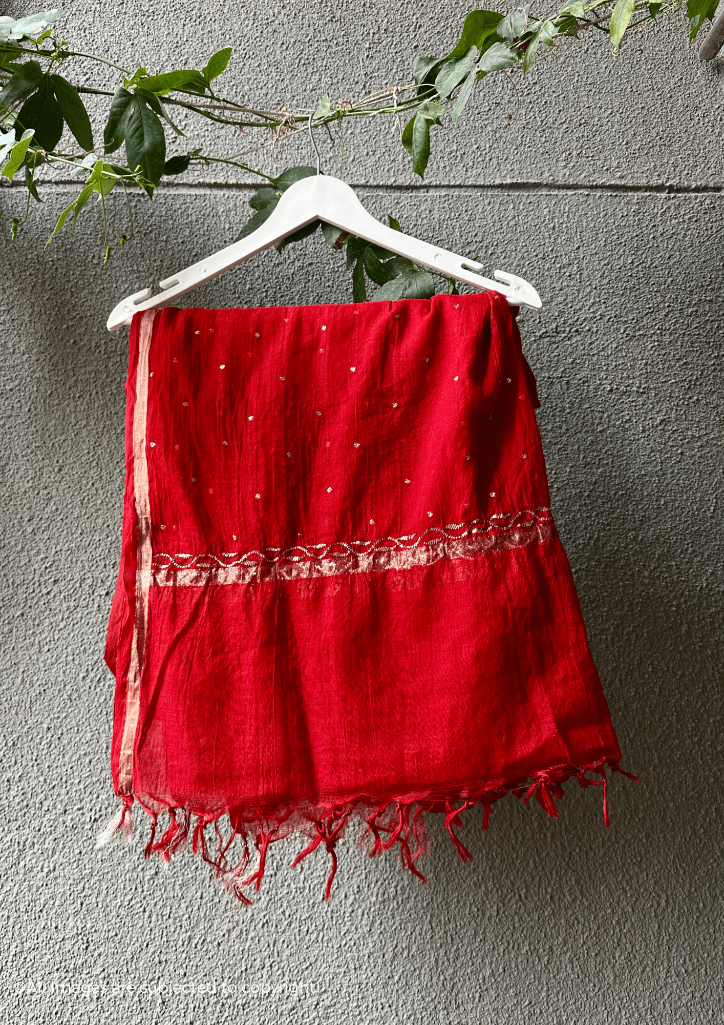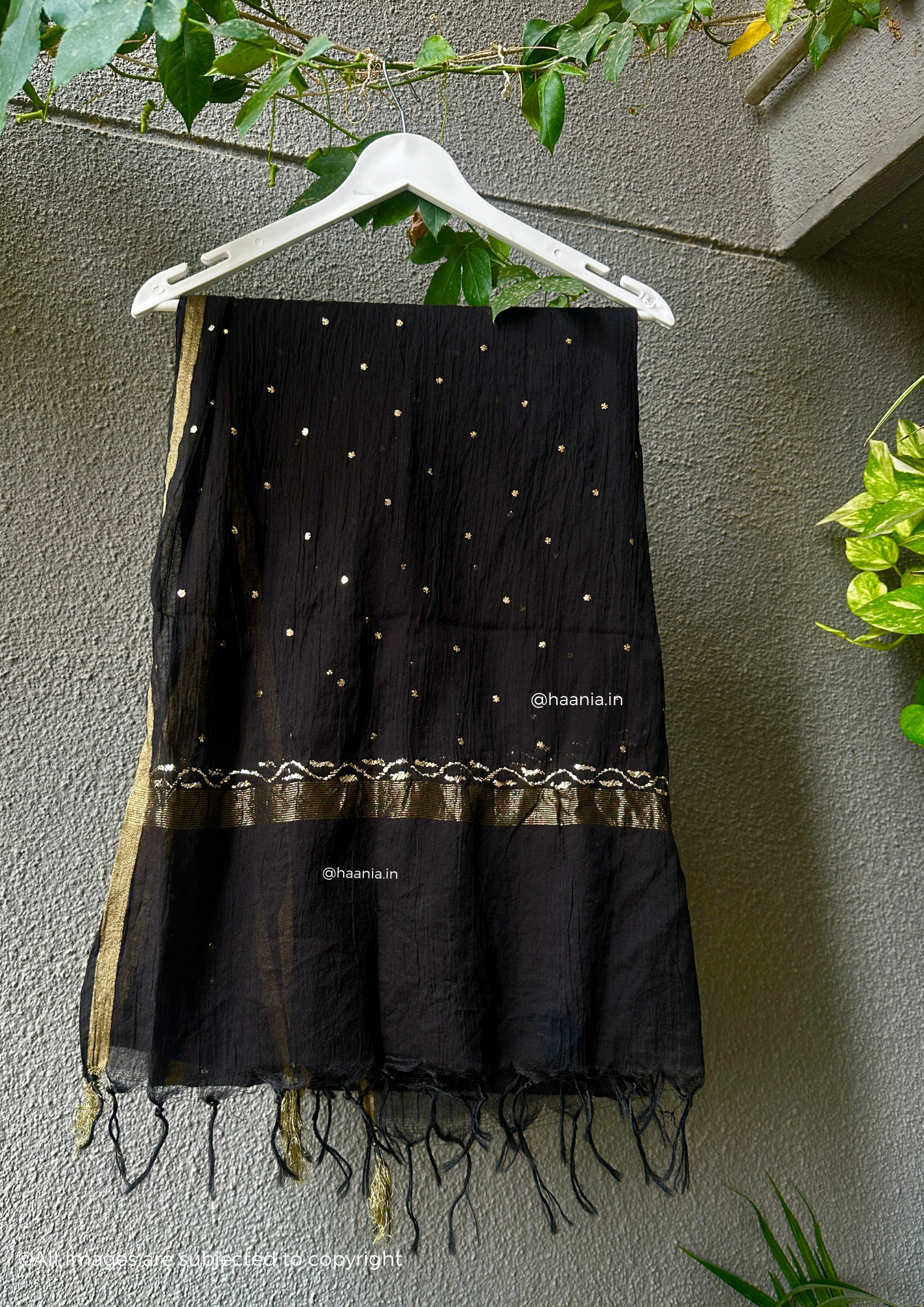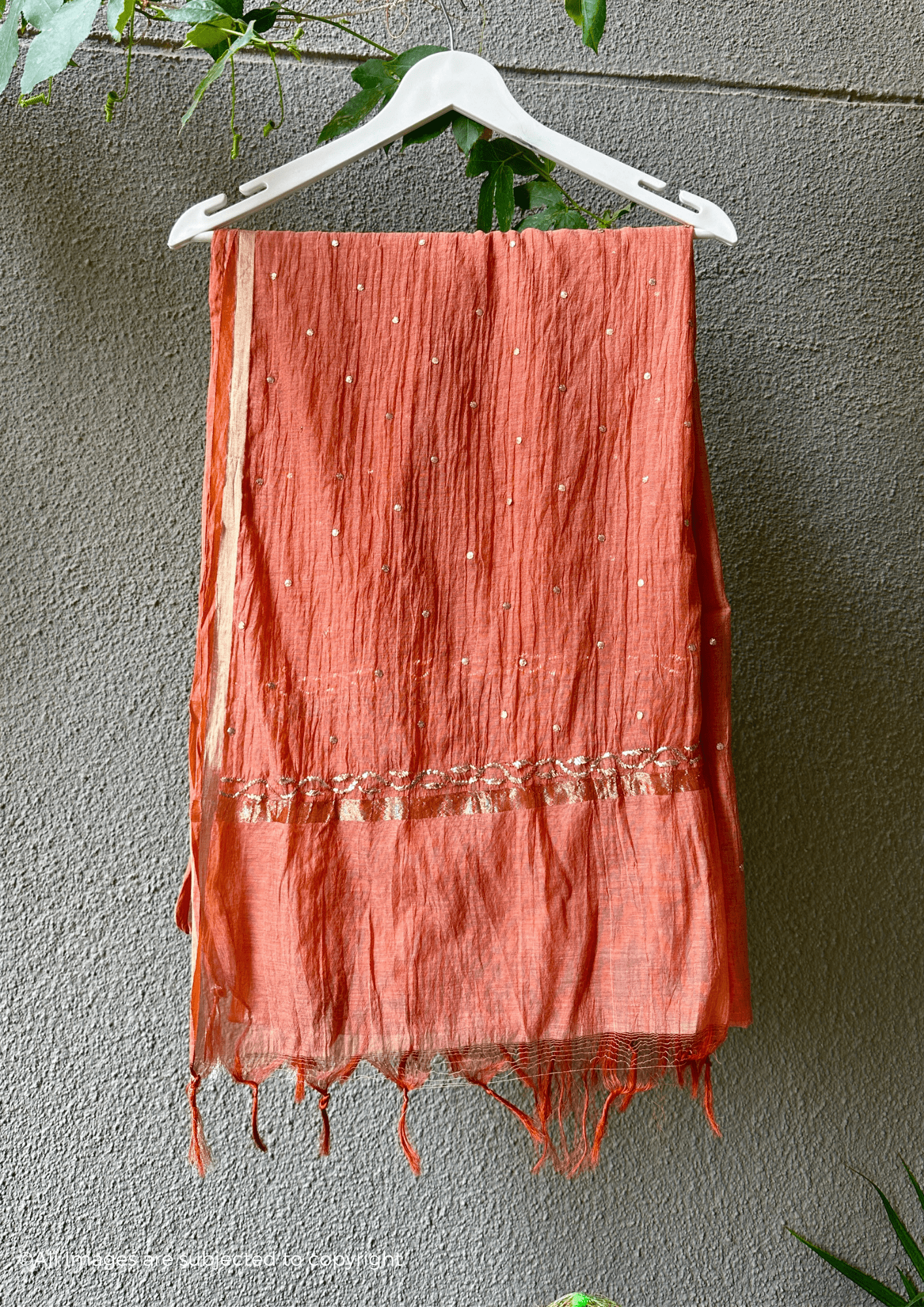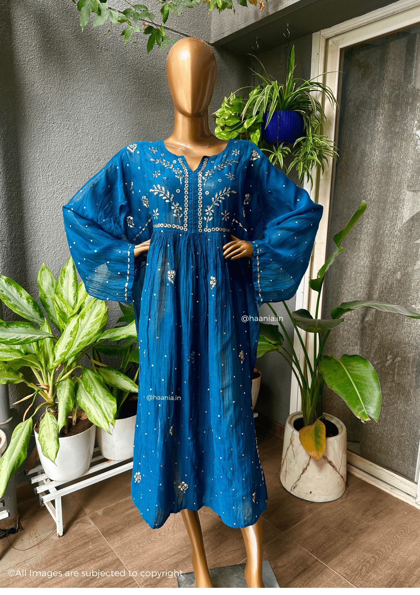 Indulge in the opulent luxury of this Chikankari Mul Chanderi A-line Kurta Set, featuring intricate mukaish kamdani work and a stunning mul chanderi dupatta. Perfect for special occasions and events, the set exudes elegance and sophistication with its festive shades and exquisite pitta mukaish accents. The tunic dress style is adorned with a heavy mukaish kamdani work yoke, while the matching dupatta boasts ring mukaish detailing.