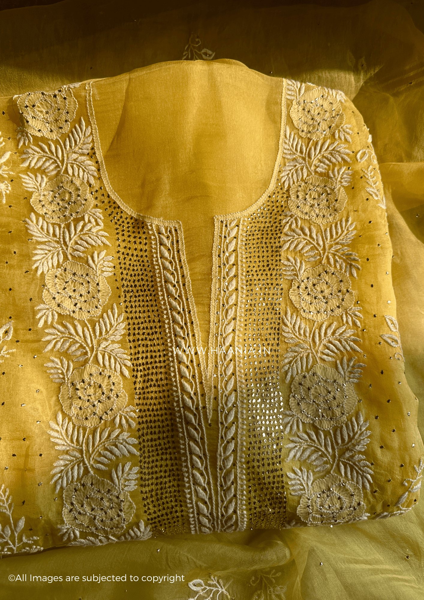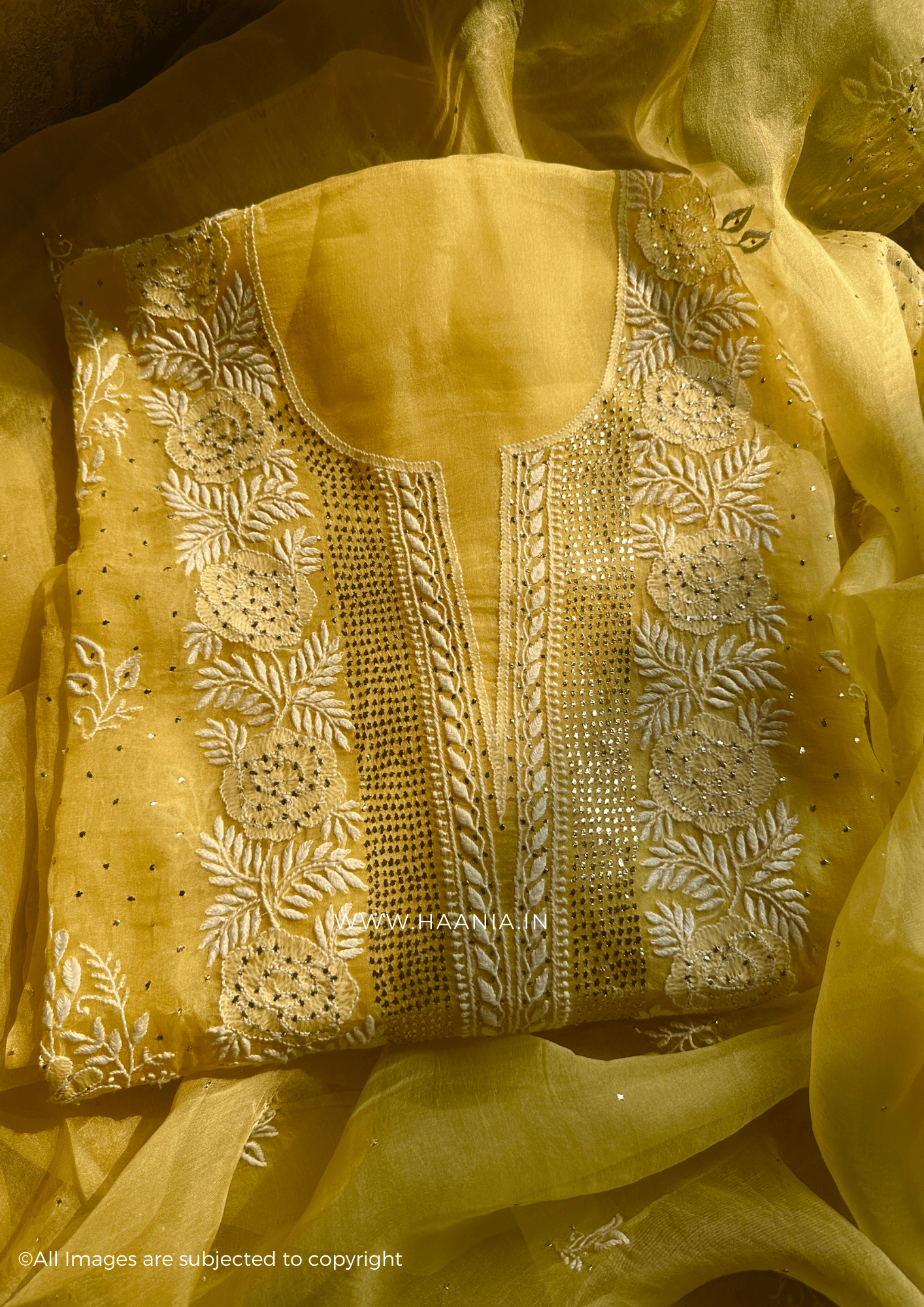 Chikankari Organza Silk Unstitched Suit Set With Mukaish Embellishments