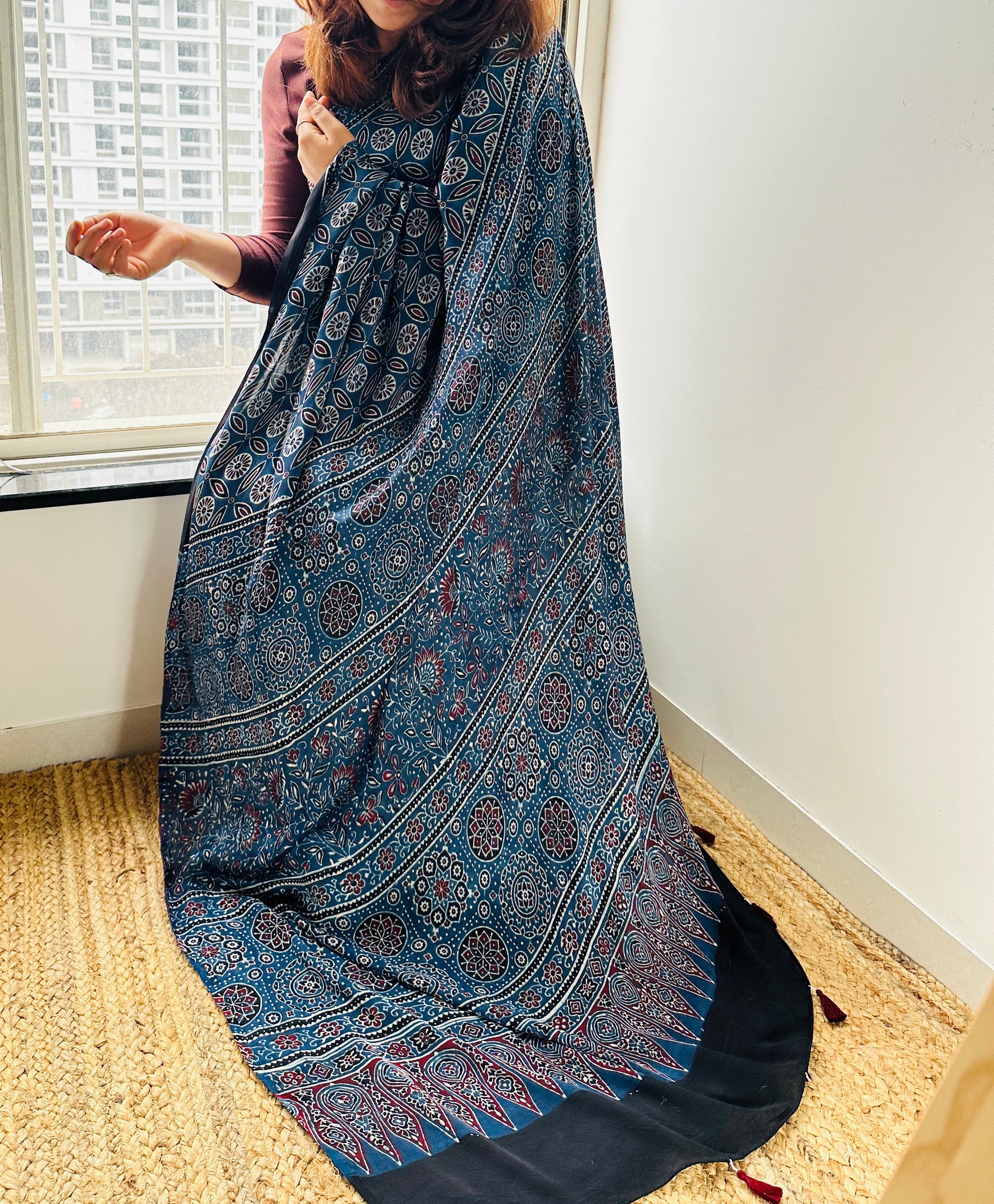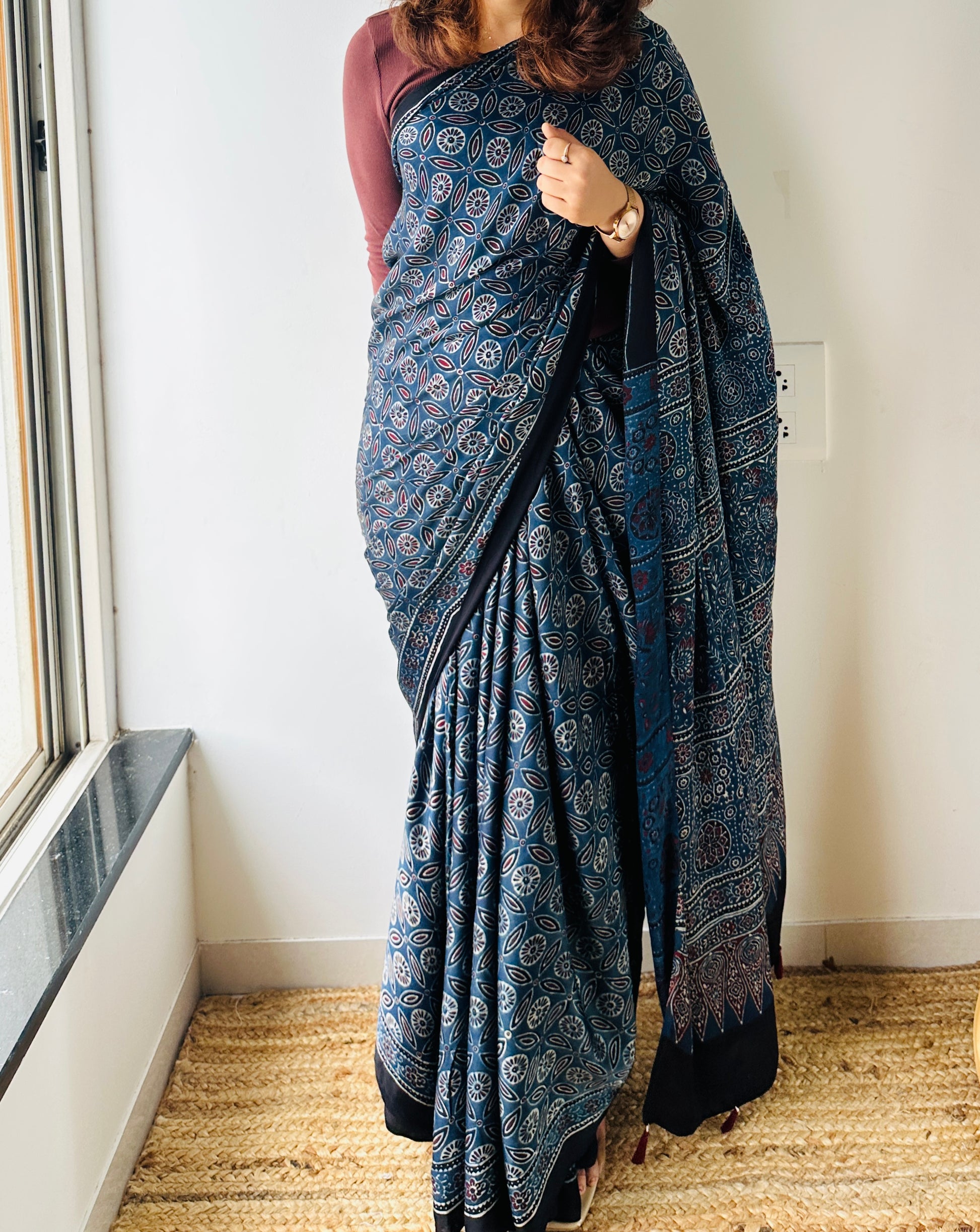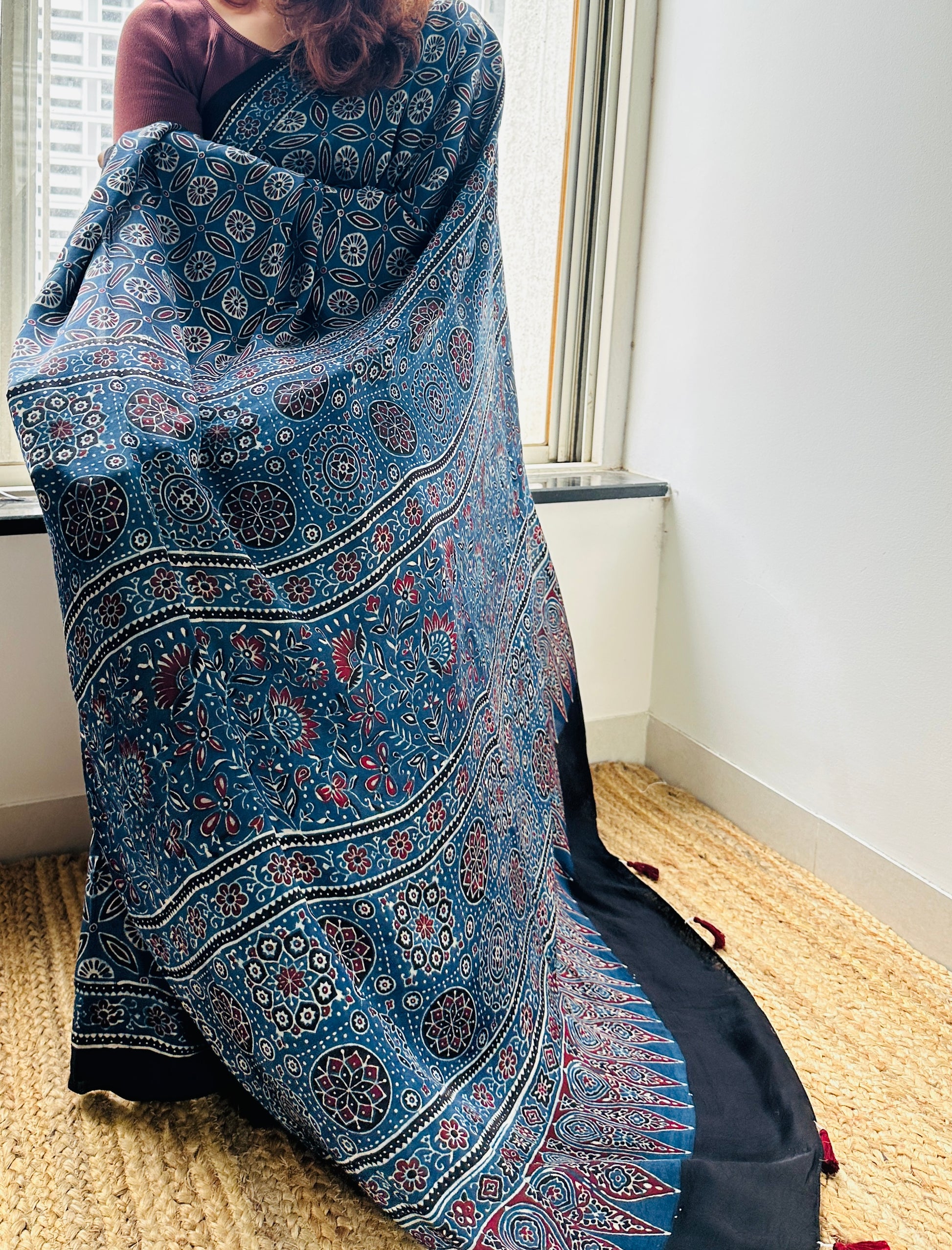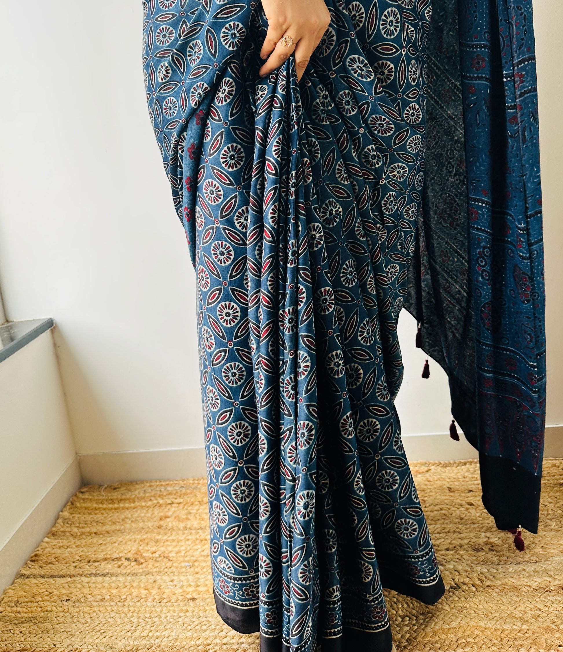 Hand Blocked Sustainable Ajrak Blue Saree with Tassels