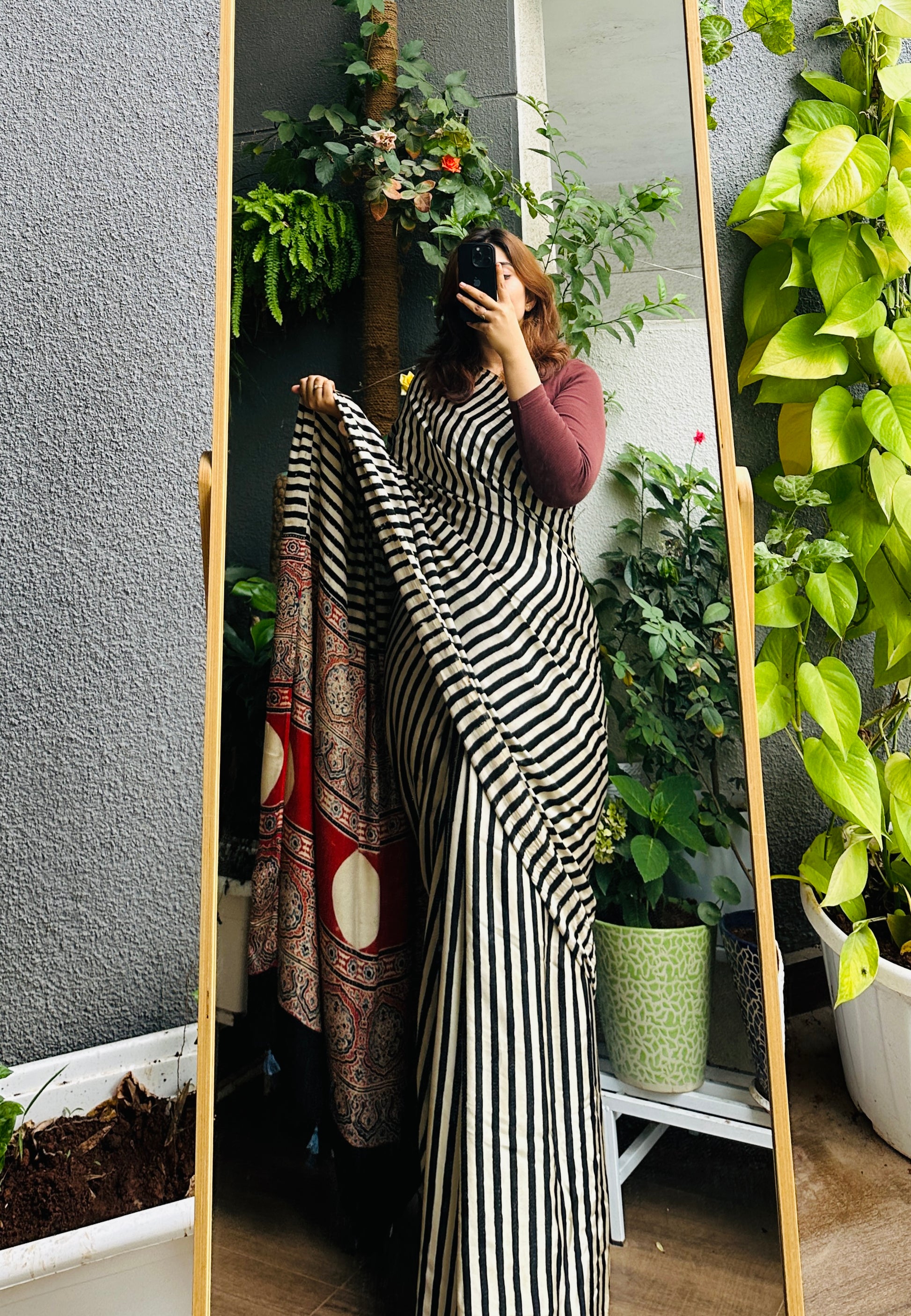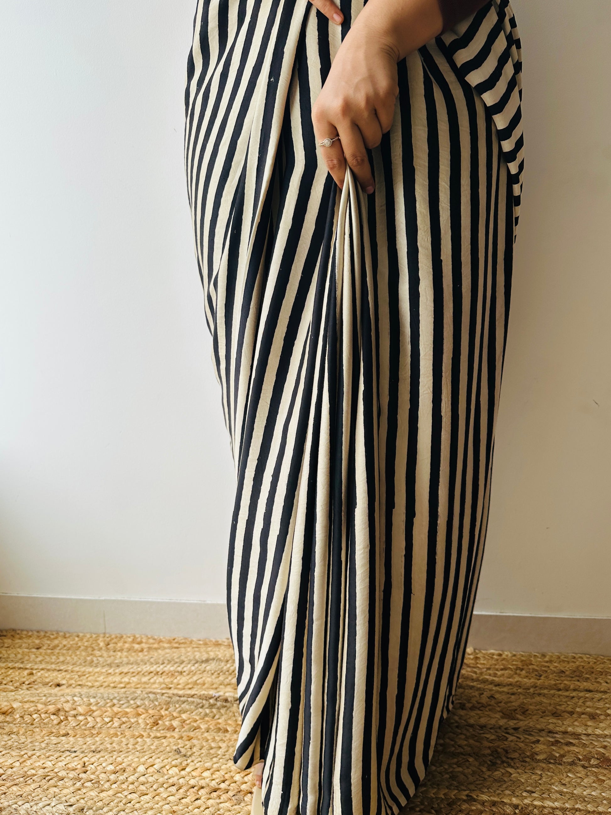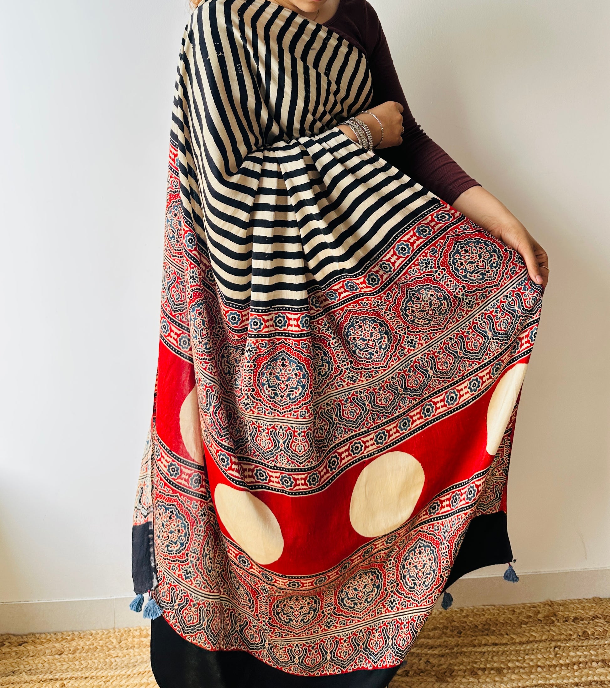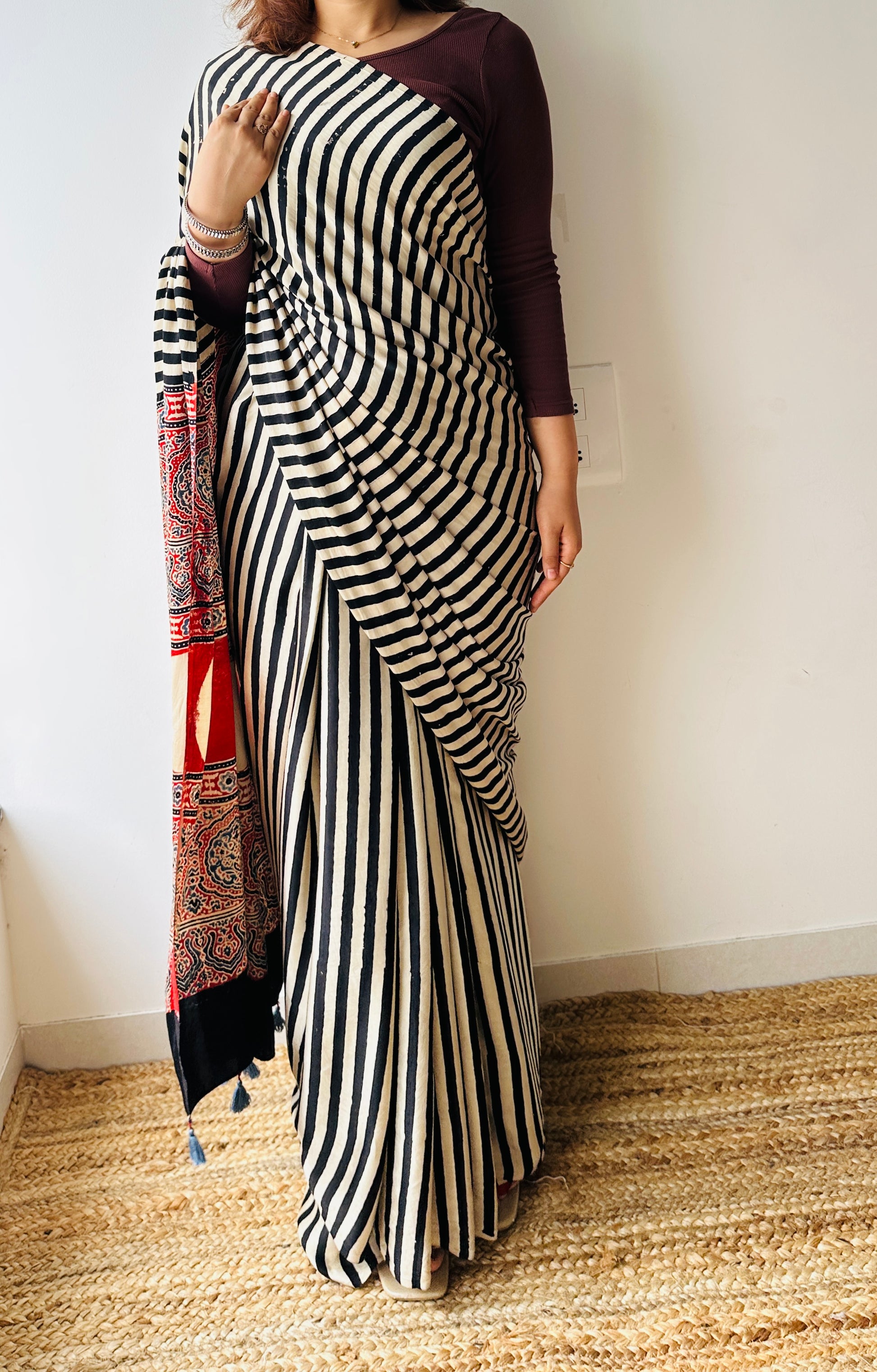 Handblocked Sustainable Ajrak Black & white Stripe Saree with Tassels