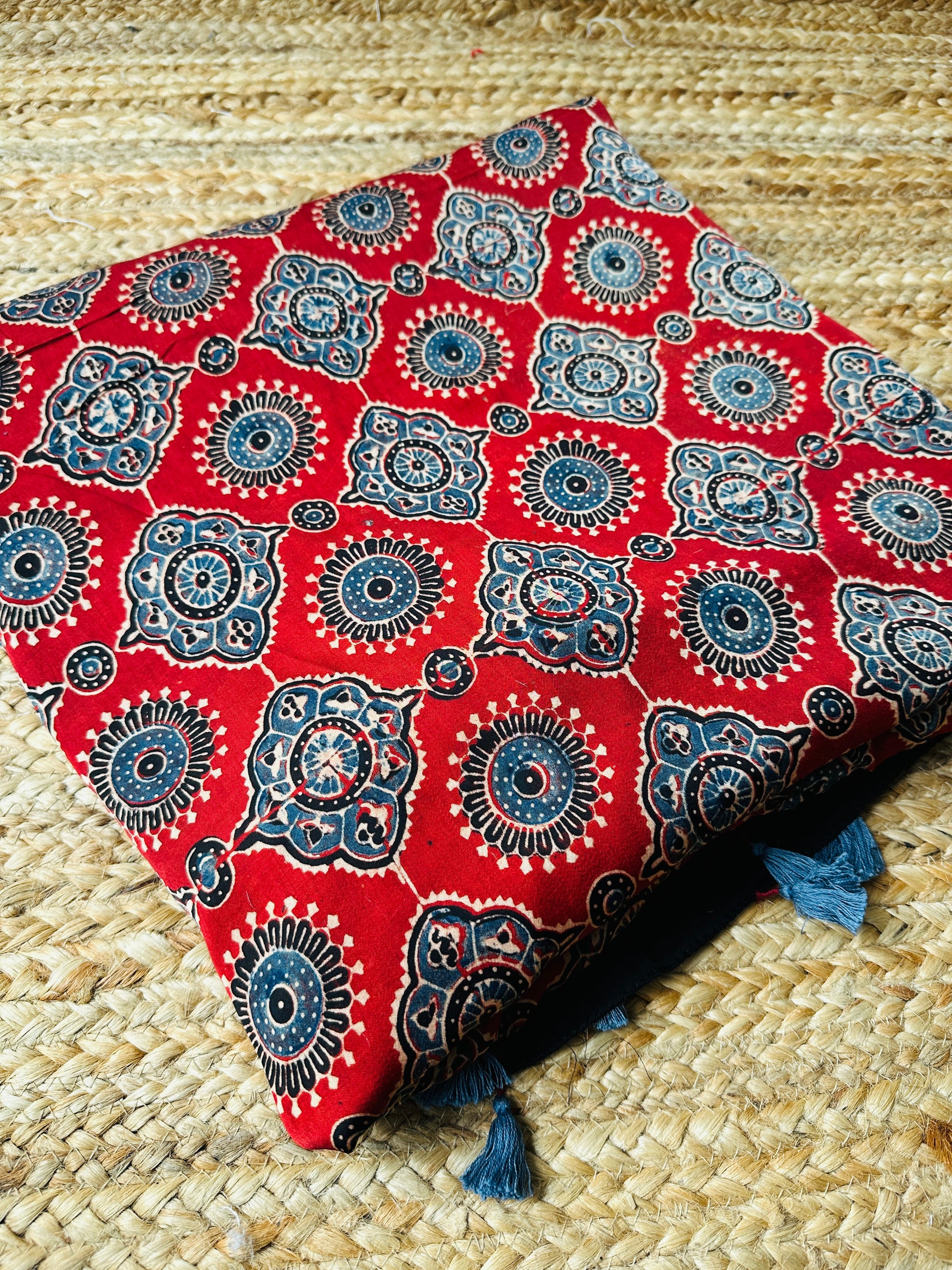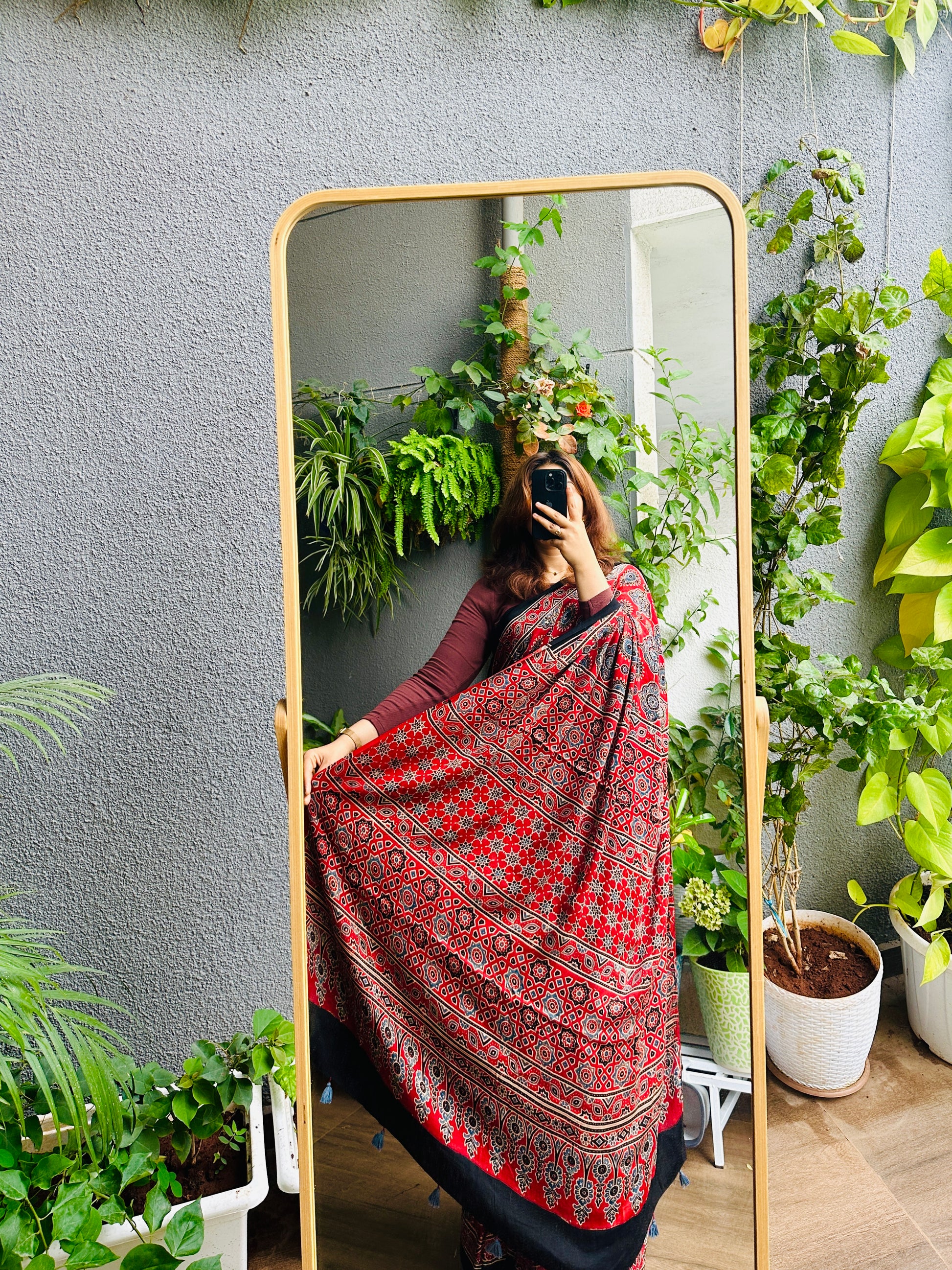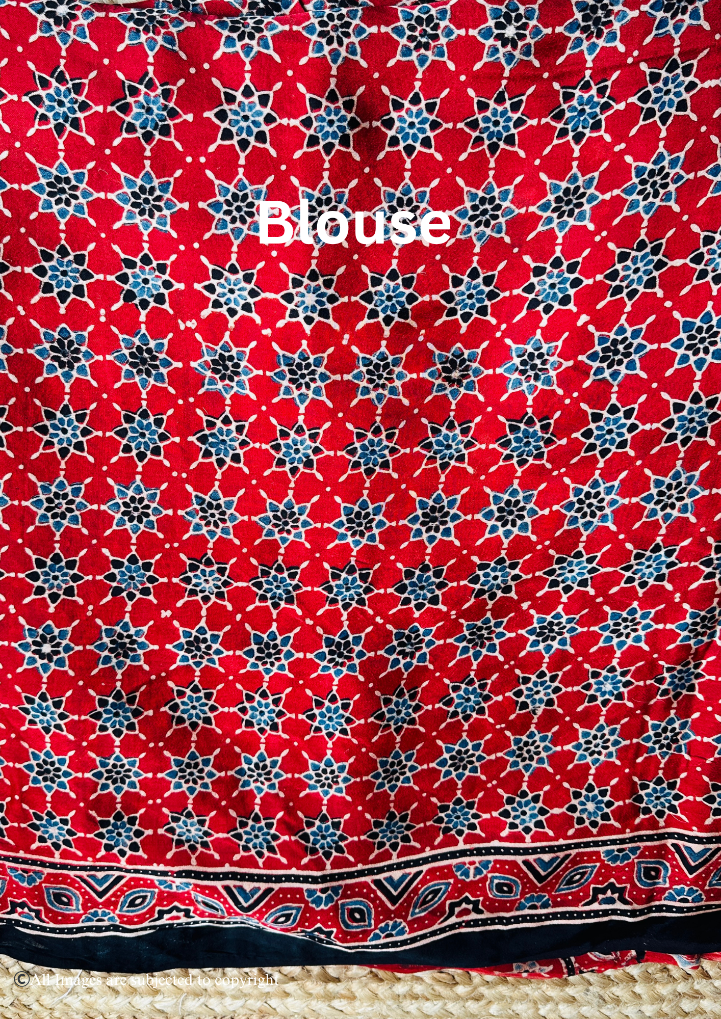Handblocked Sustainable Ajrak Red & Blue Saree with Tassels