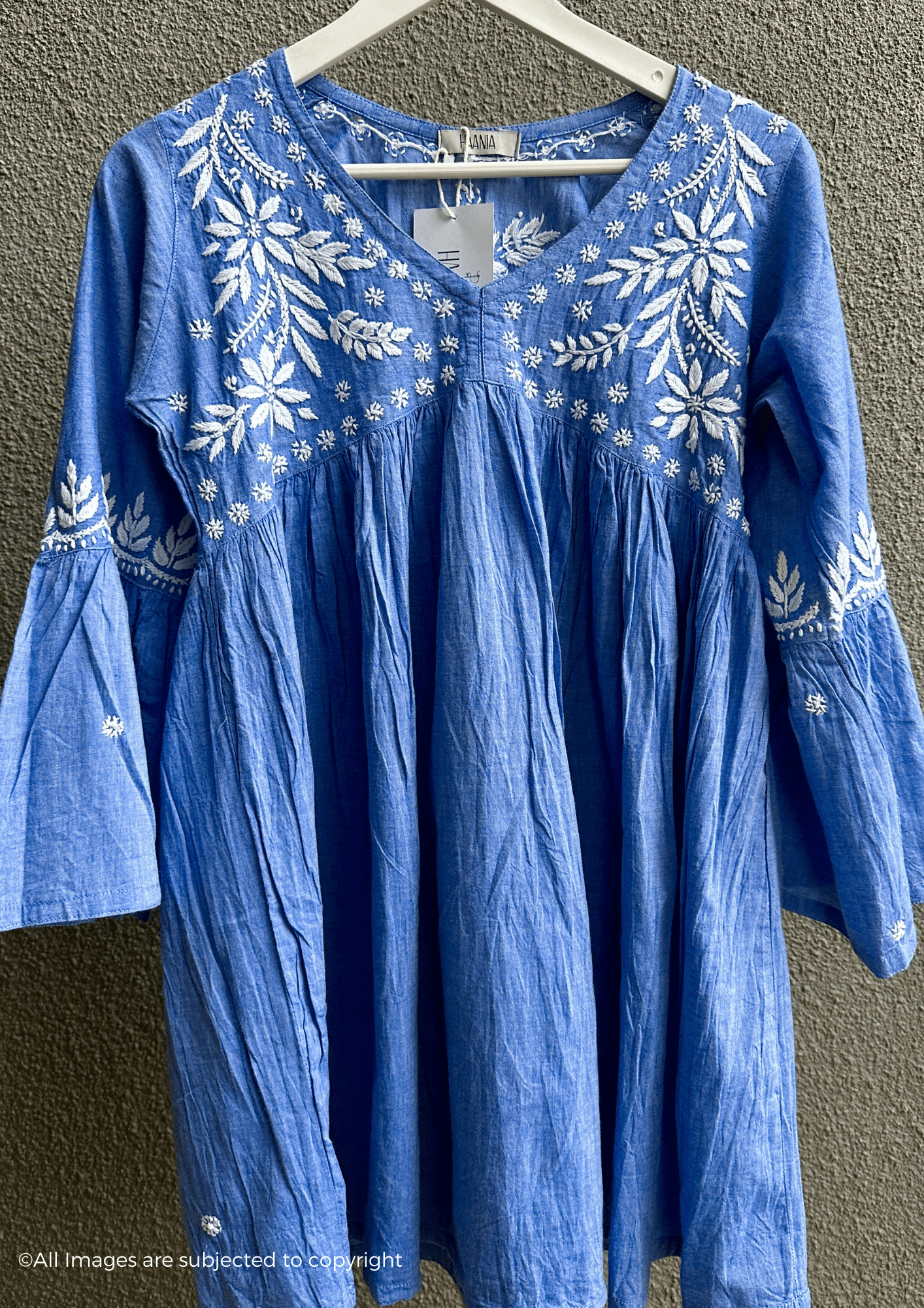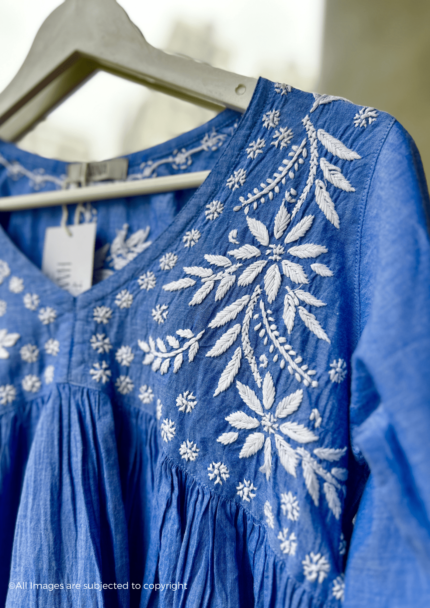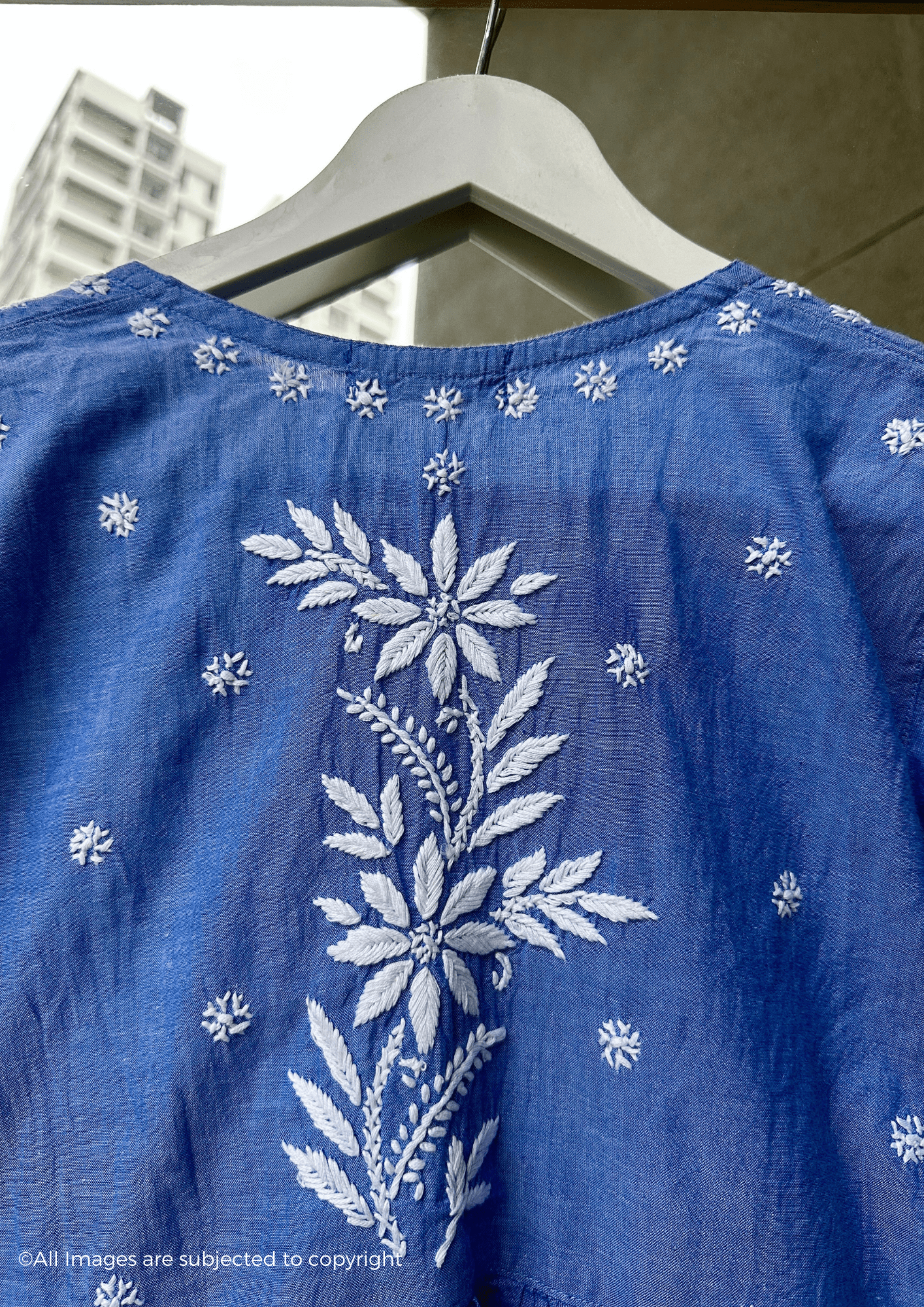 Meticulously handcrafted Chikankari embroidery adorns this short top that presents the aesthetic of denim while actually being crafted from premium cambric cotton. This thoughtful fabric selection ensures exceptional breathability and comfort for extended wear. The traditional Chikankari technique brings an artisanal touch to this contemporary silhouette, making it a versatile addition to your wardrobe.