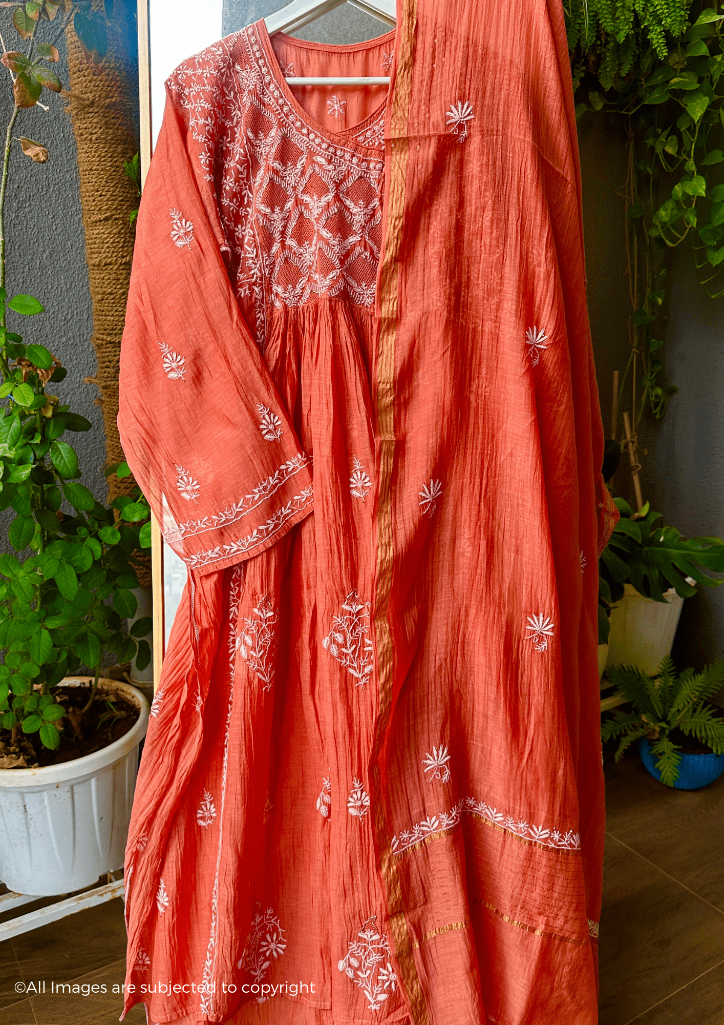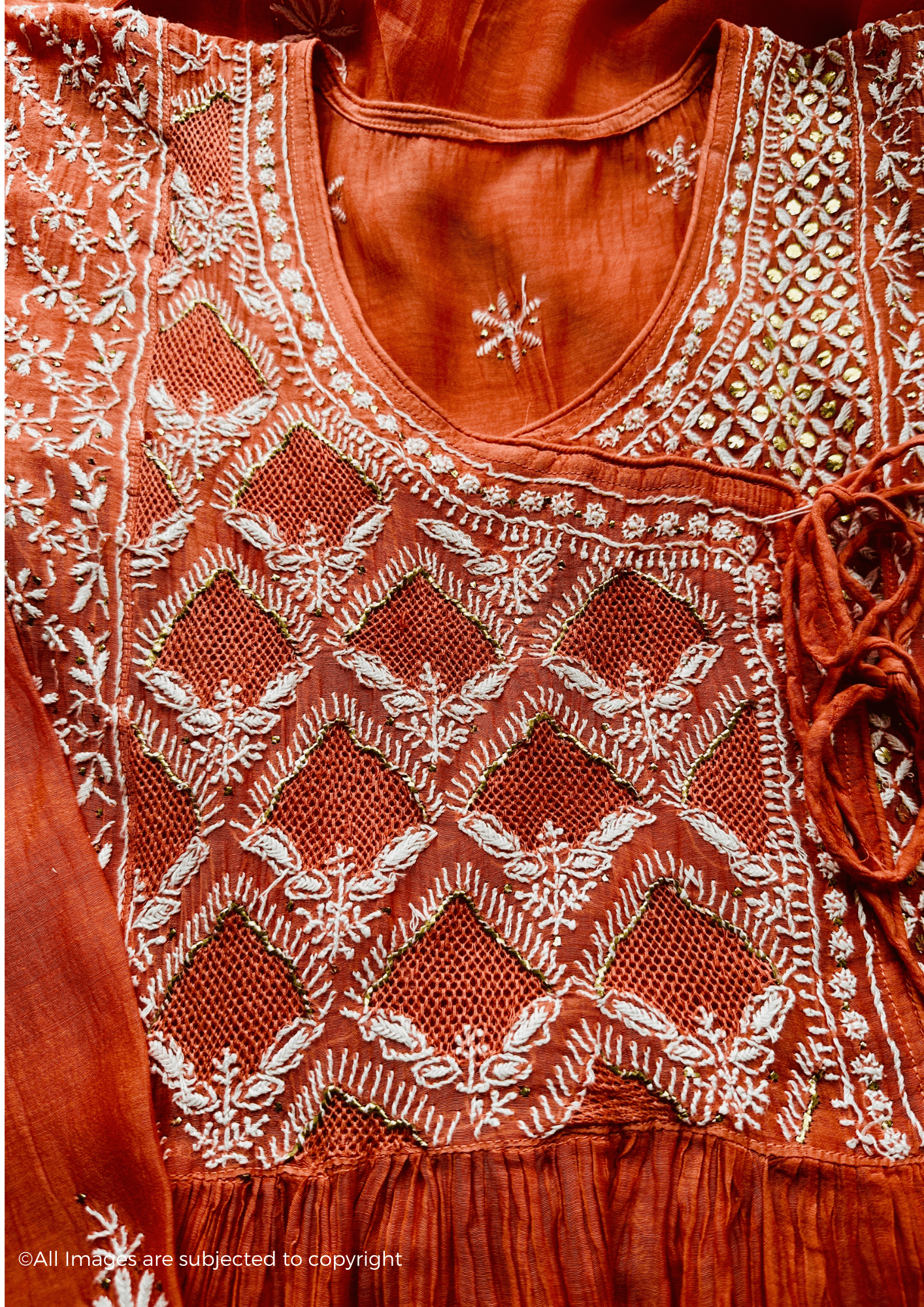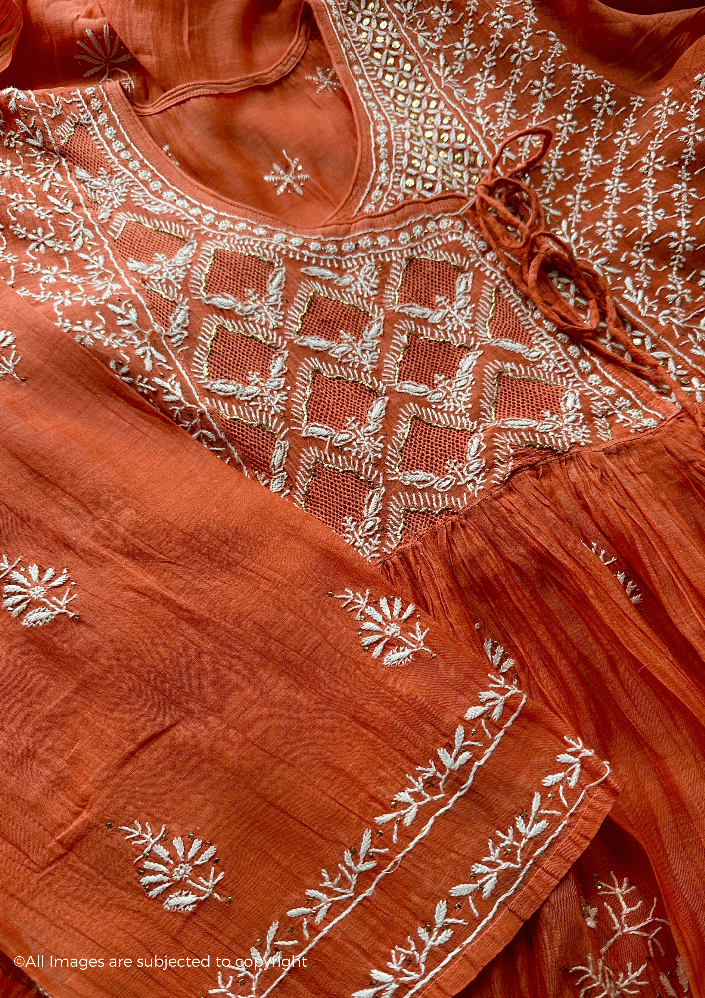 Handcrafted Chikankari Mul Chanderi Angrakha with Kasab Jaal & Kamdani Embellishments