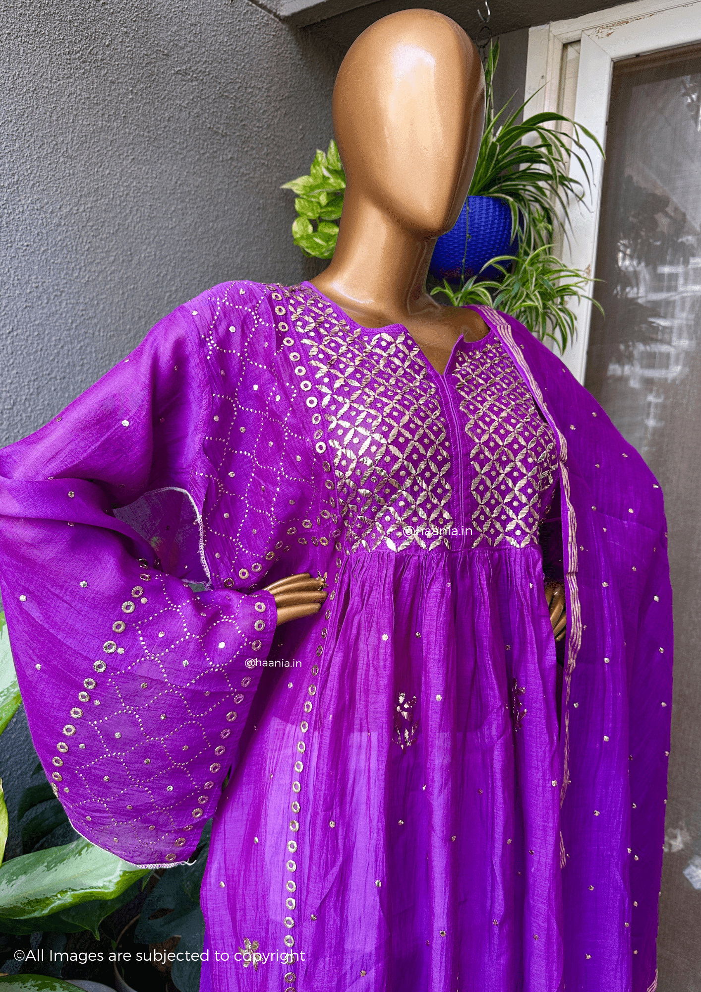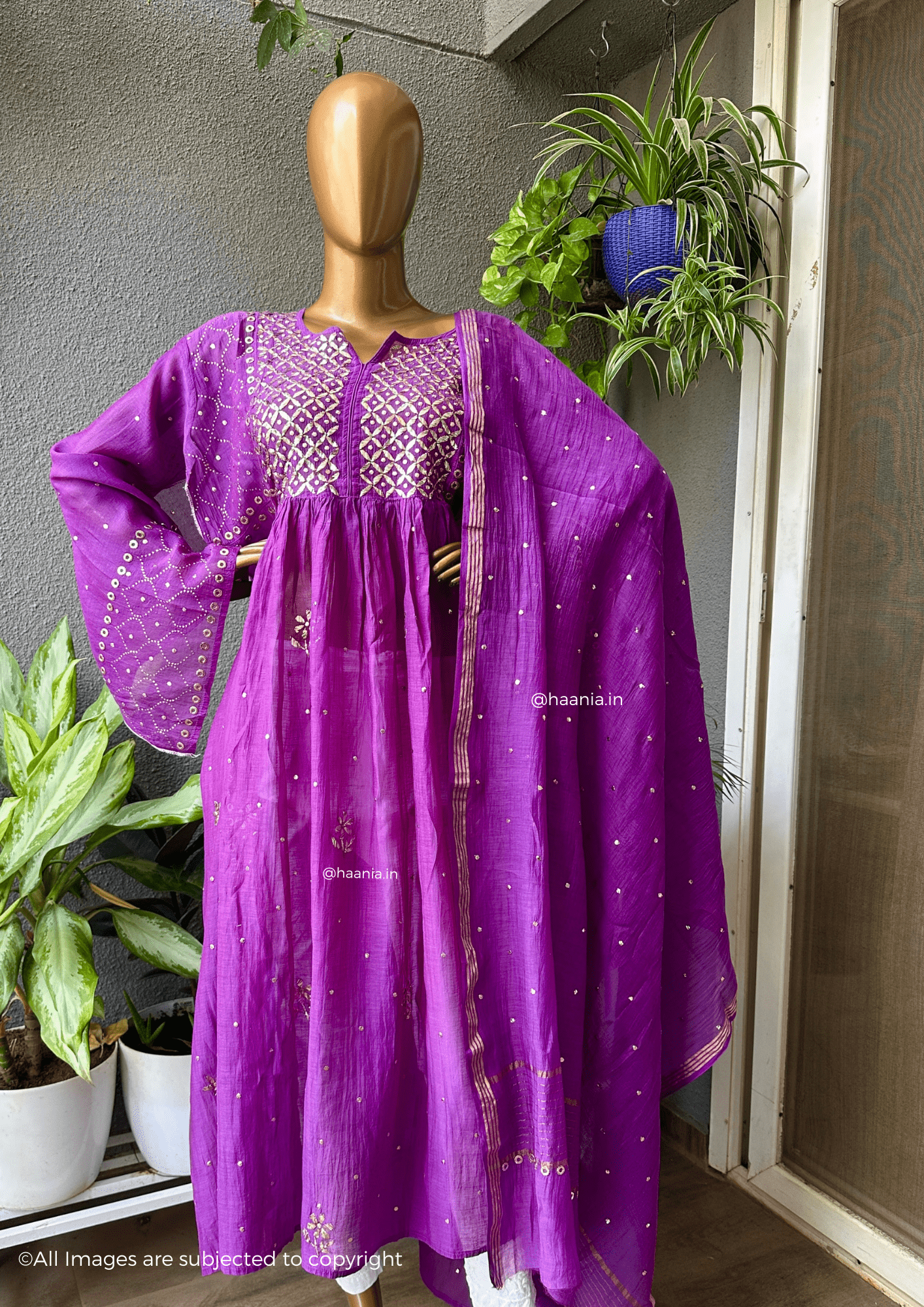 This Premium Mul Chanderi Semi Stitched A-line kurta and Dupatta Set features exquisite chikankari work and intricate mukaish kamdani details, perfect for special occasions. The festive shades and heavy Mukaish Kamdani Work on yoke add a touch of elegance to this luxurious piece. Complete the look with the matching mul chanderi dupatta adorned with ring Mukaish.