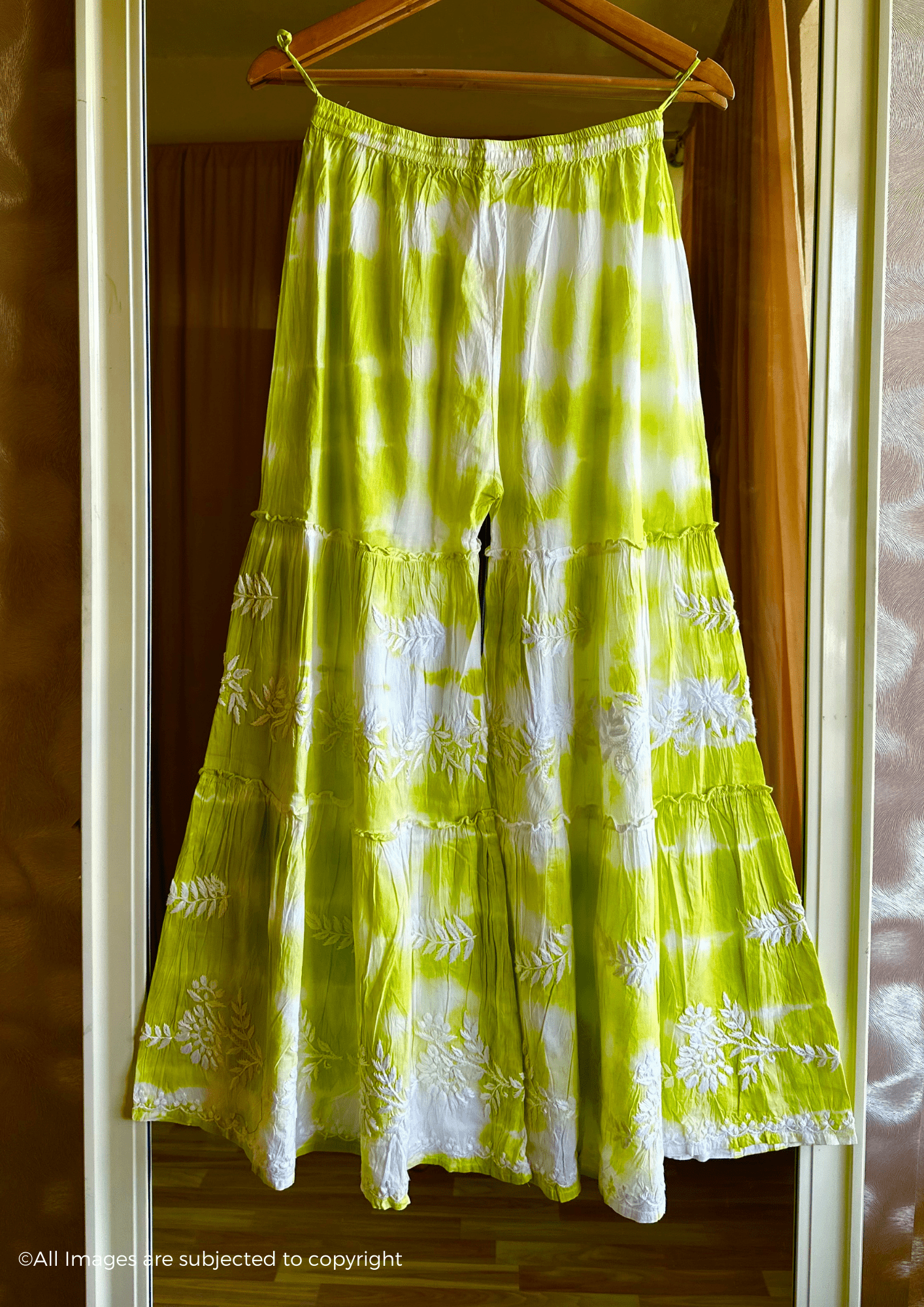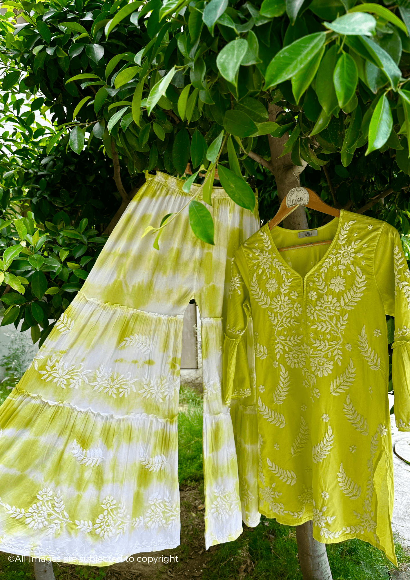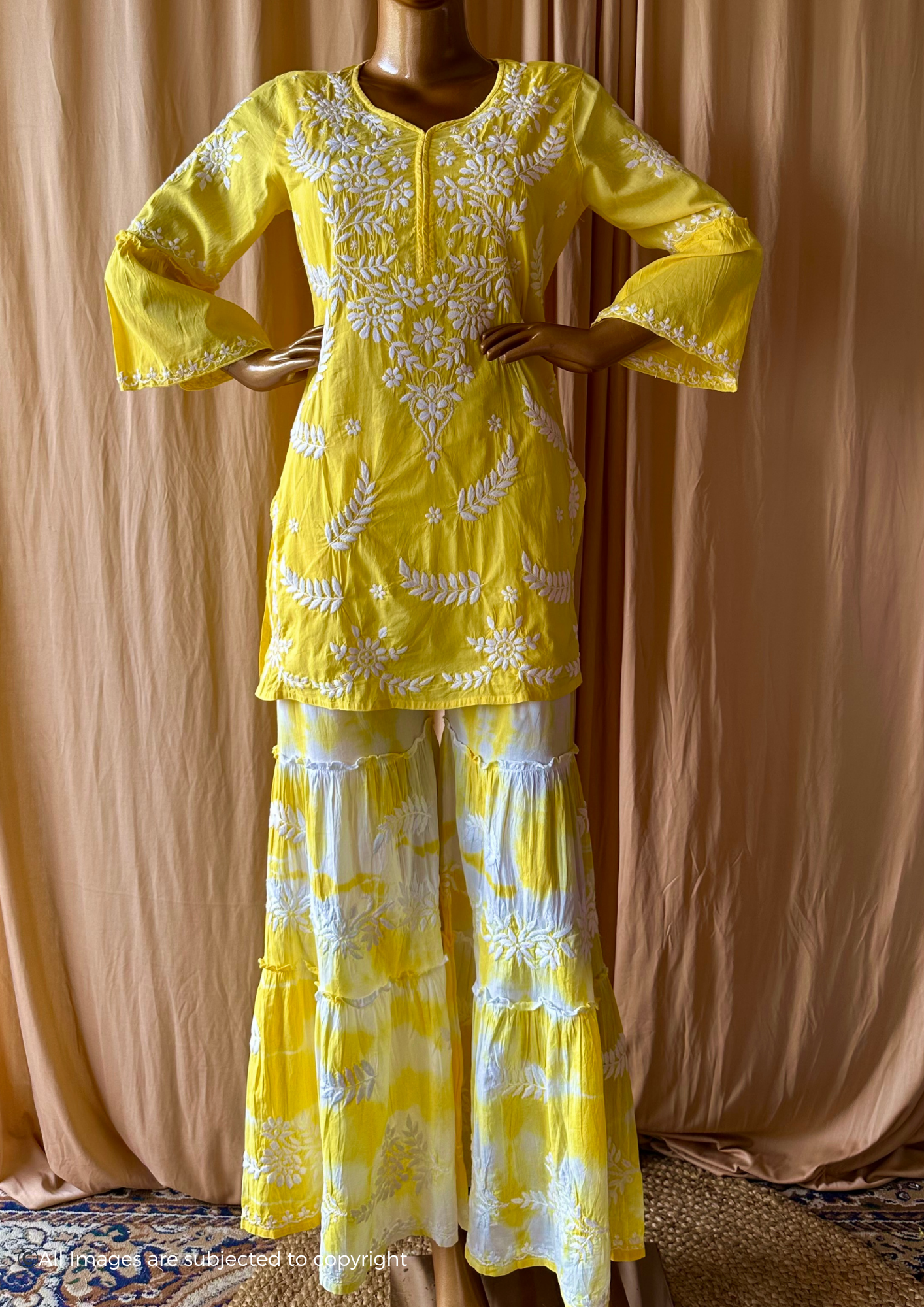 Elevate your style with this stunning Mul Cotton Chikankari Garara set. Handcrafted with intricate Chikankari embroidery and a beautiful tie dye pattern, this set exudes luxury and exclusivity. Perfect for special occasions, this set will make you feel elegant and sophisticated.