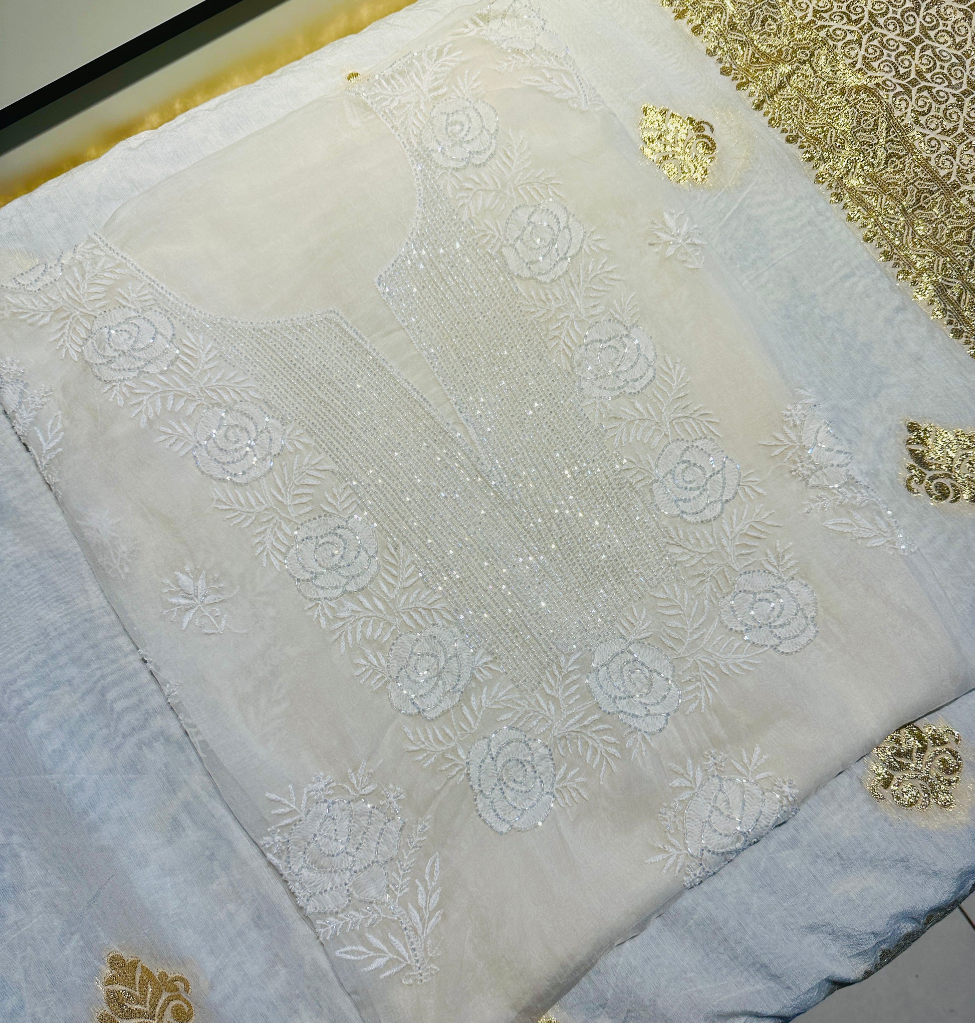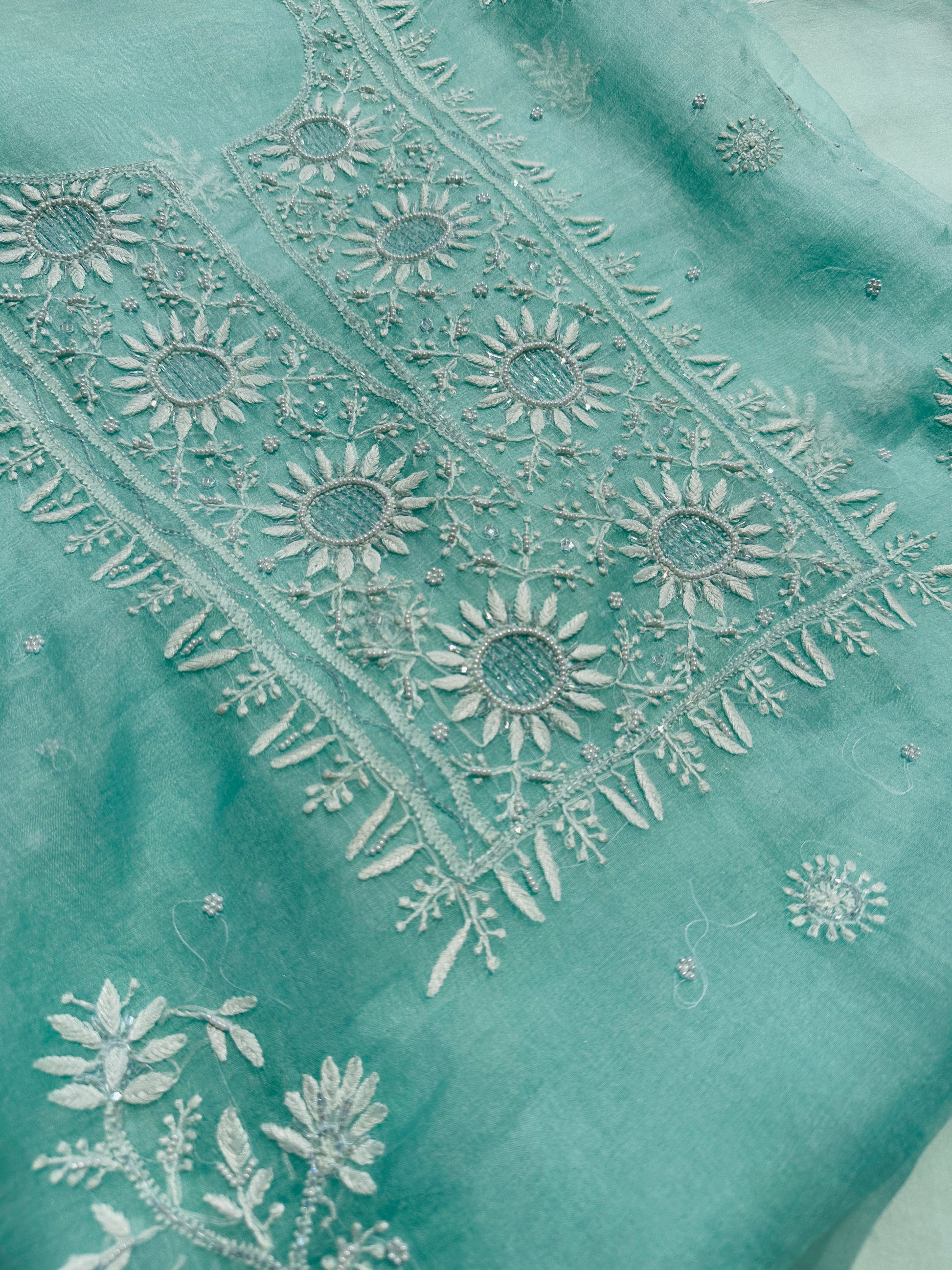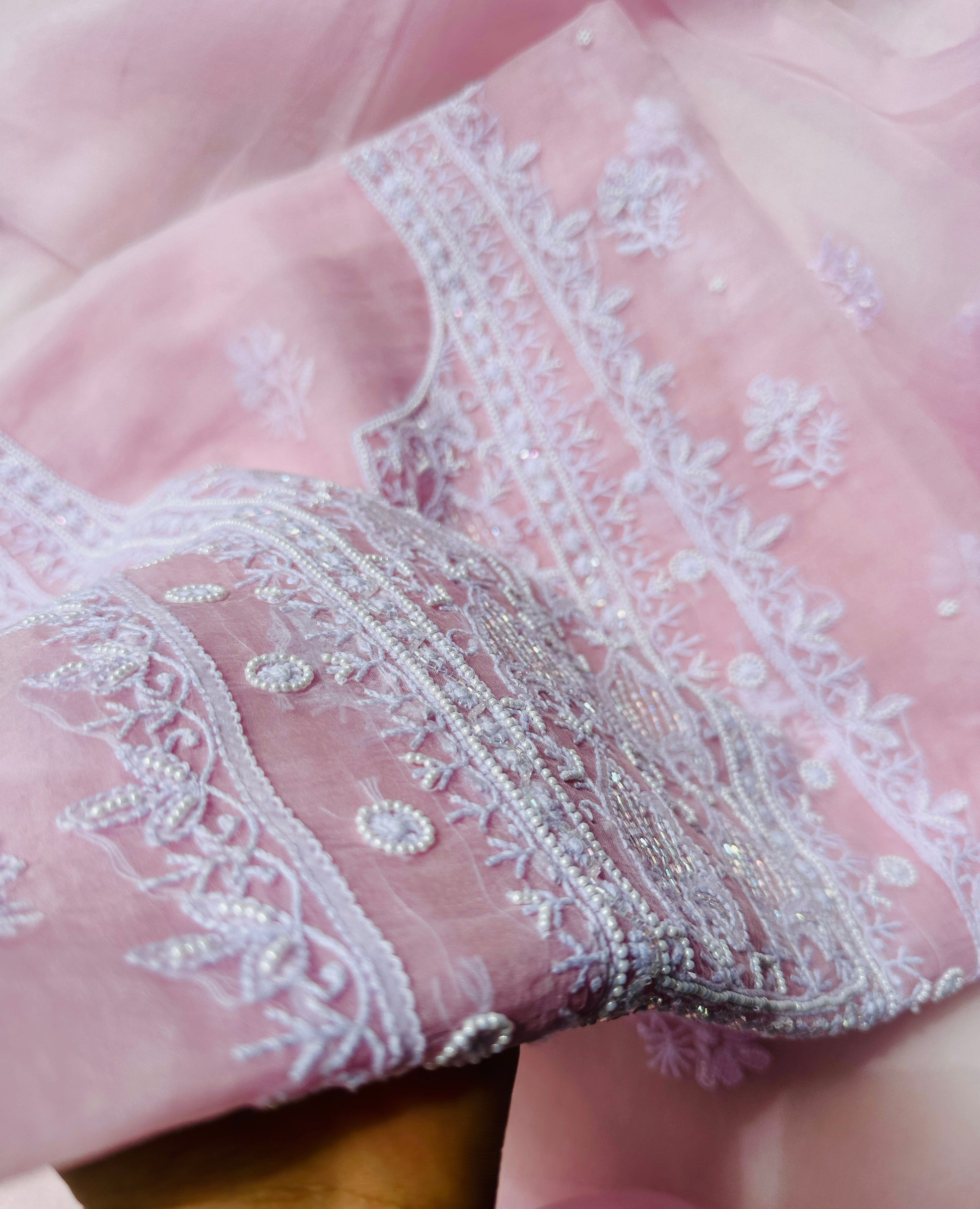 Elevate your ethnic wardrobe with this exquisite Organza Chikankari Unstitched Suit Set, a perfect blend of traditional craftsmanship and contemporary elegance. Crafted on premium sheer organza fabric, this suit features intricate Chikankari embroidery, showcasing timeless artistry with delicate floral and paisley motifs. The ensemble is further enhanced with hand-embellished pearl and cutdana work, adding a subtle shimmer and luxurious texture to the design.
