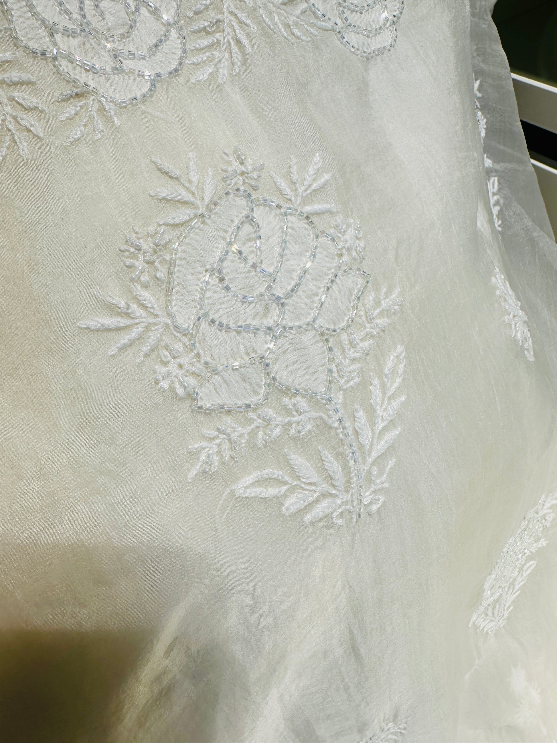 Embellishments: Hand-applied pearls and cutdana
