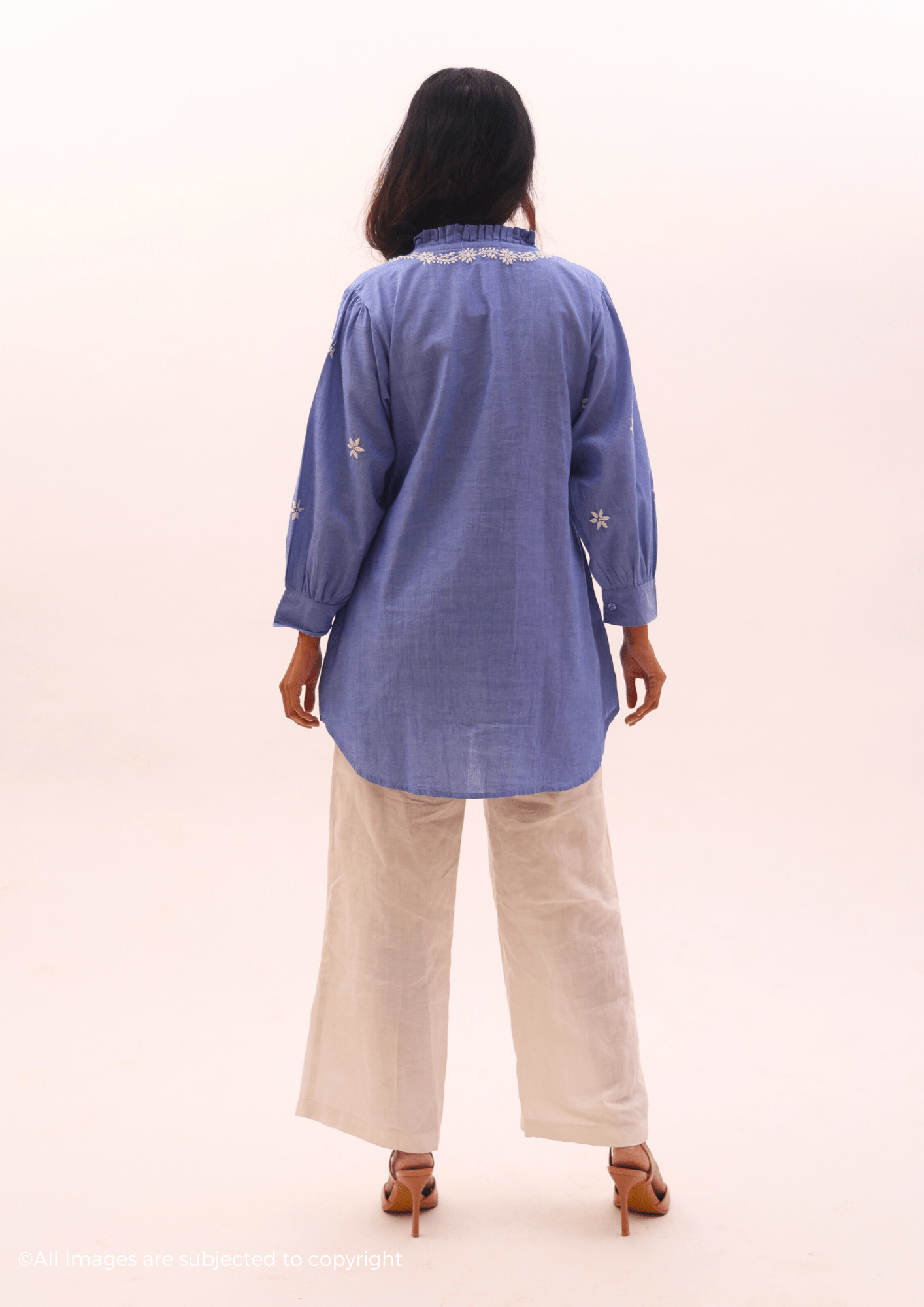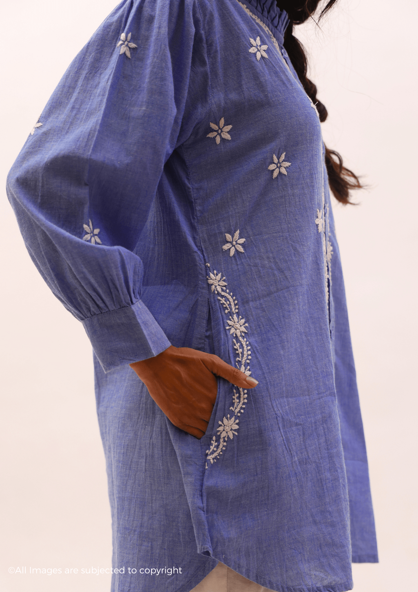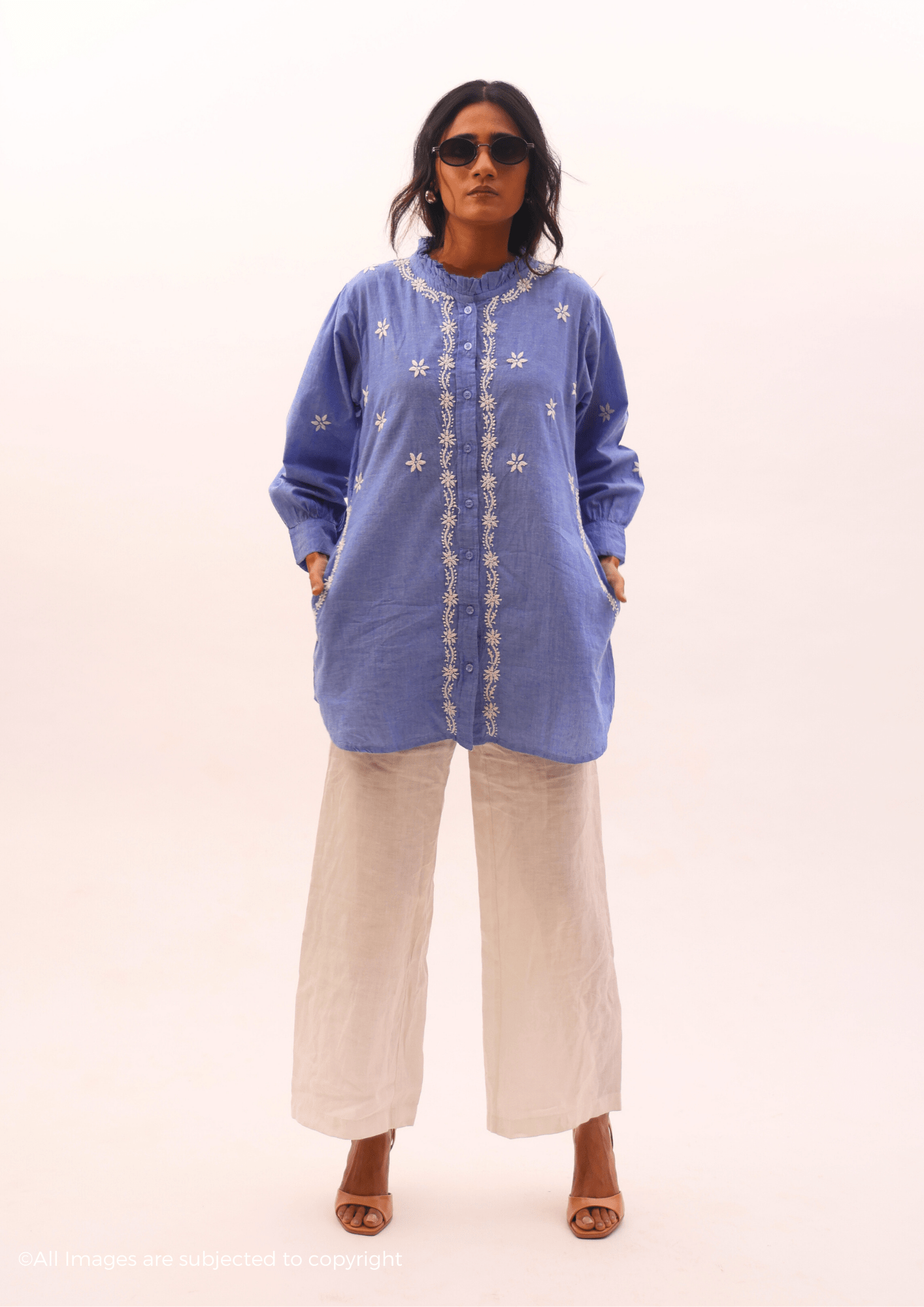 Indulge in pure luxury with the Rosella Handcrafted Chikankari Shirt. Made from opulent cambric fabric, this denim-like shirt exudes sophistication and elegance. Its timeless design and impeccable craftsmanship make it a wardrobe essential that will elevate your style to new heights.
