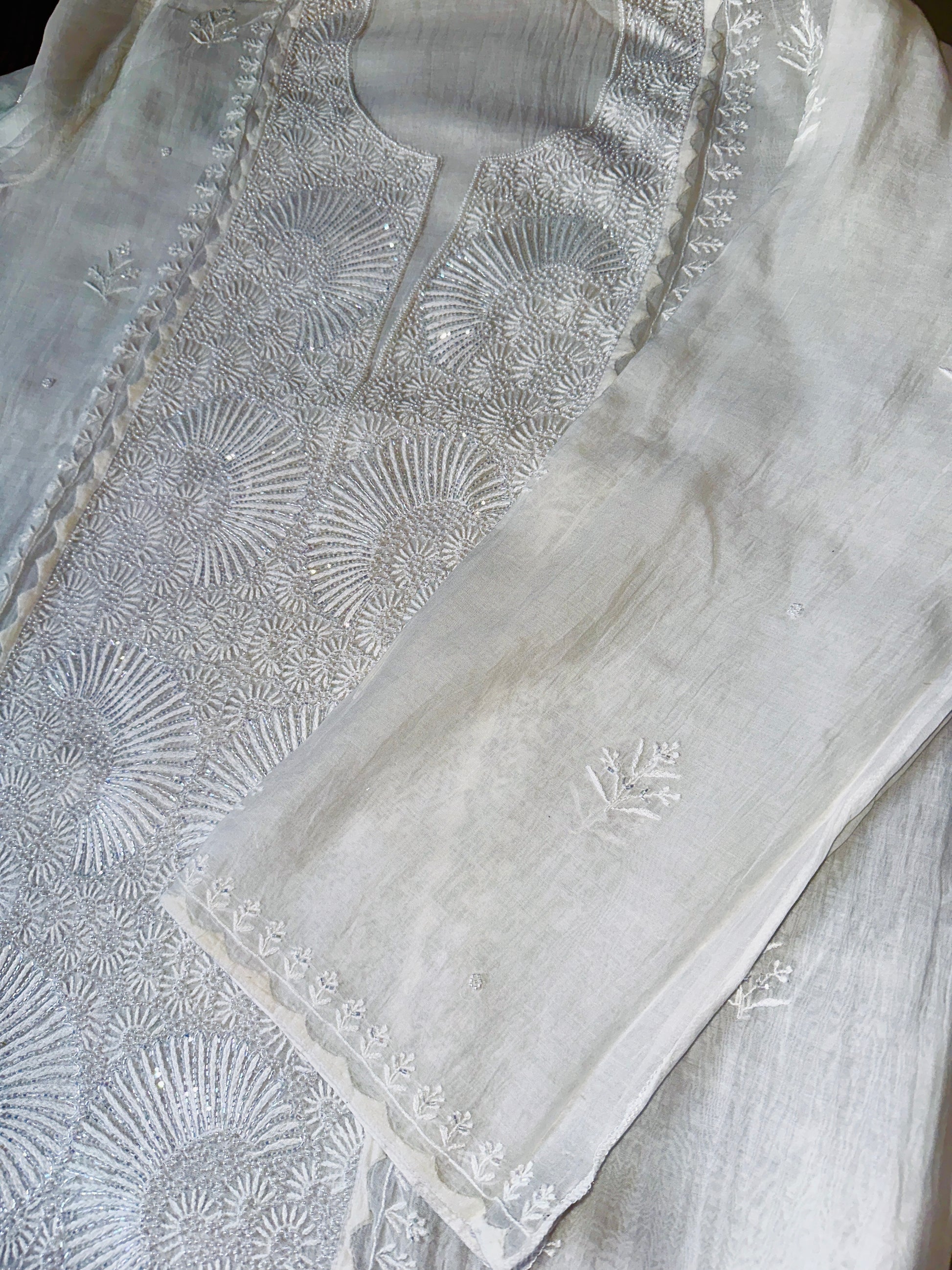 Seashell Mul Chanderi Chikankari Unstitched Suit Set