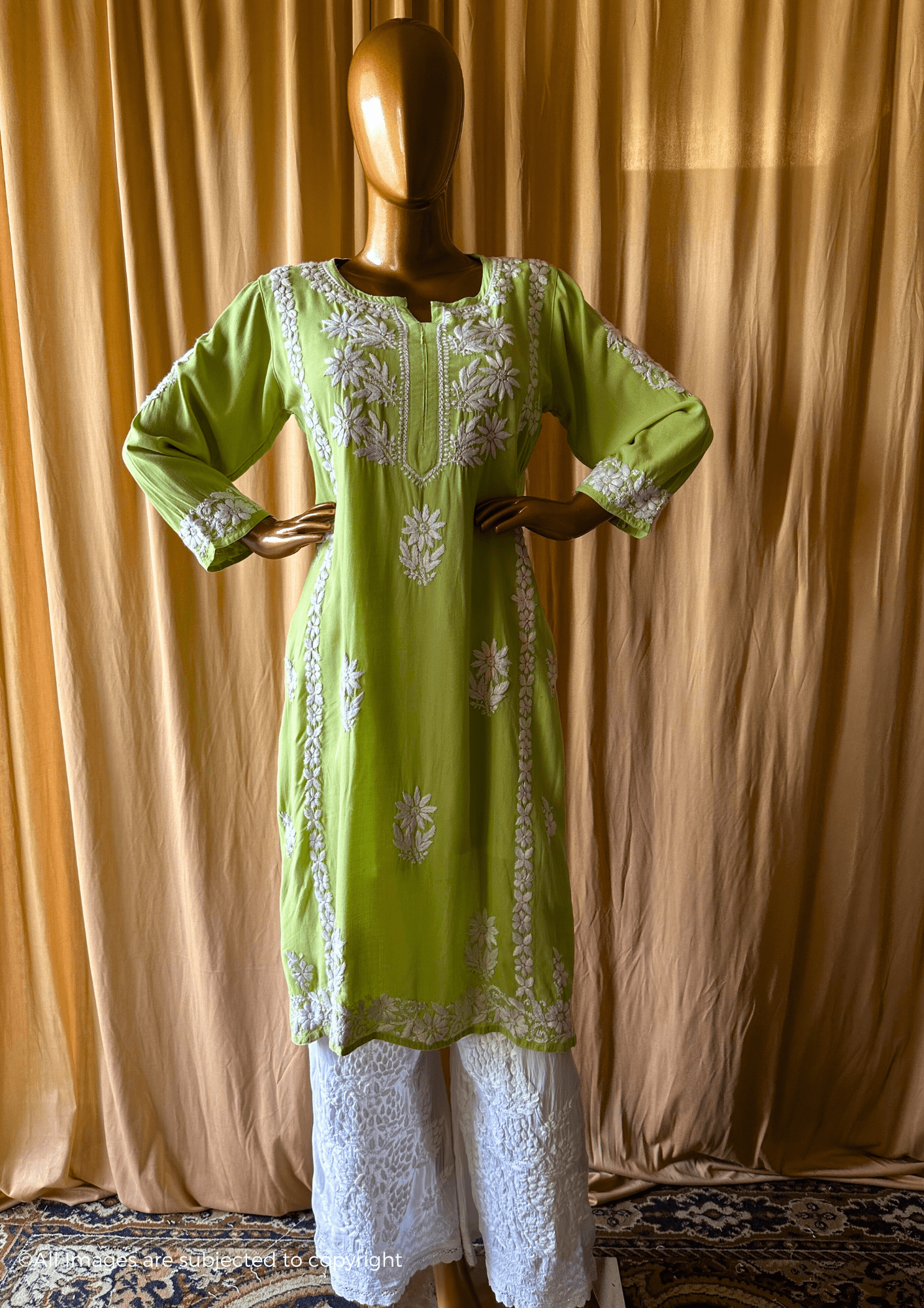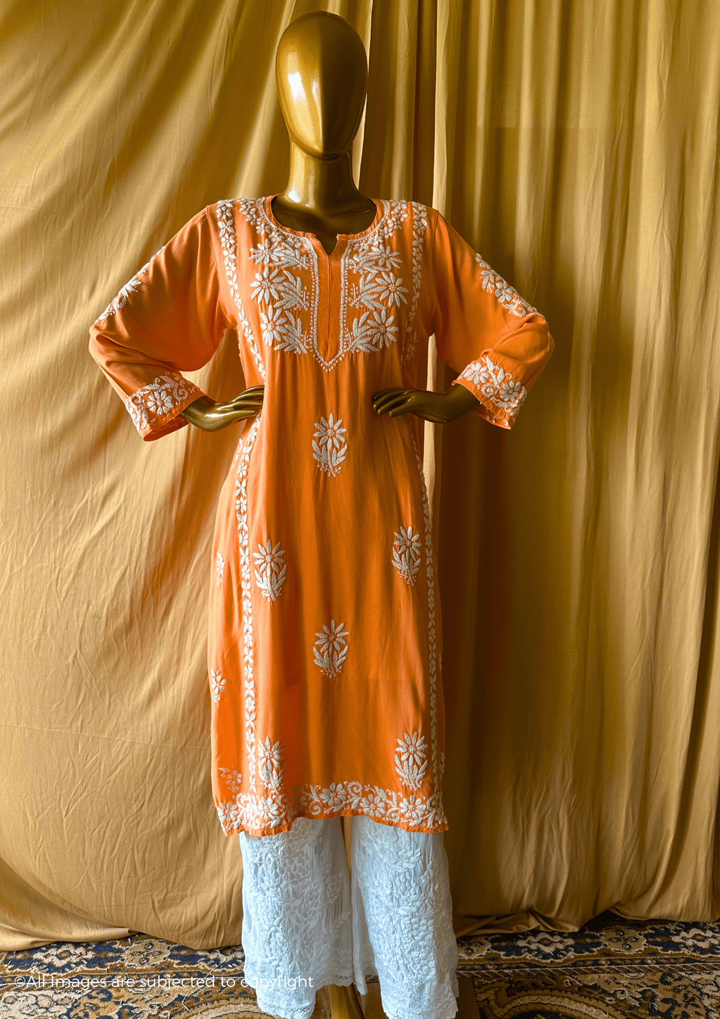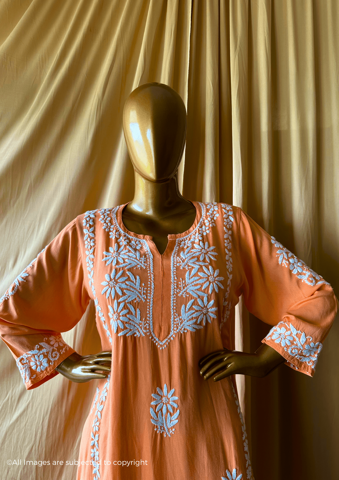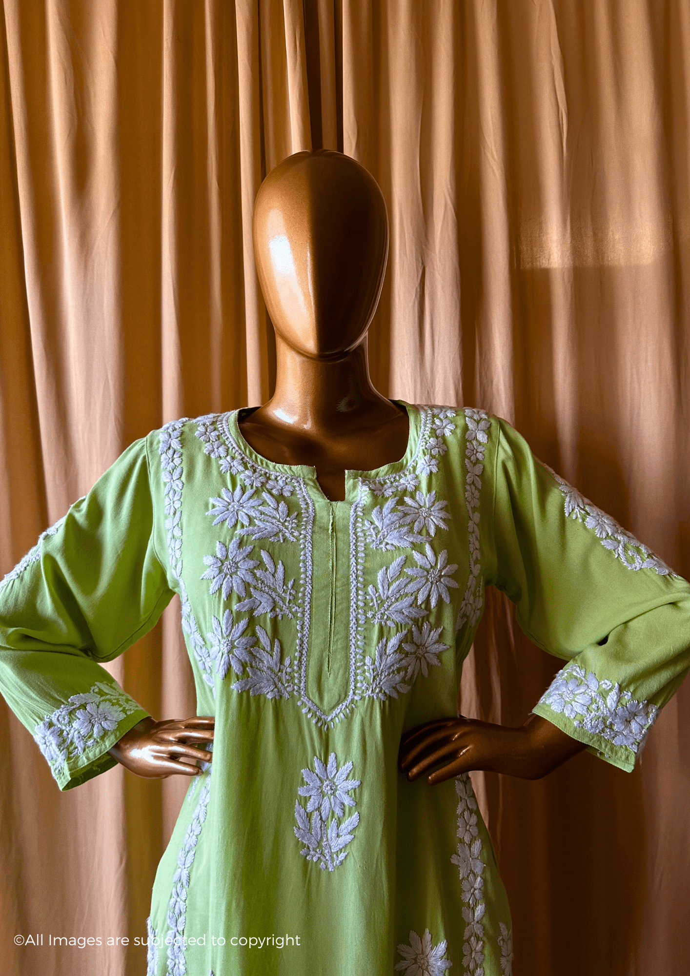 Expertly handcrafted with delicate Chikankari embroidery, the Ezra Rayon Kurti offers a non-transparent and long-lasting option with its high-quality rayon material. Perfect for any occasion, this Kurti combines traditional craftsmanship with modern design for a stylish and comfortable look.