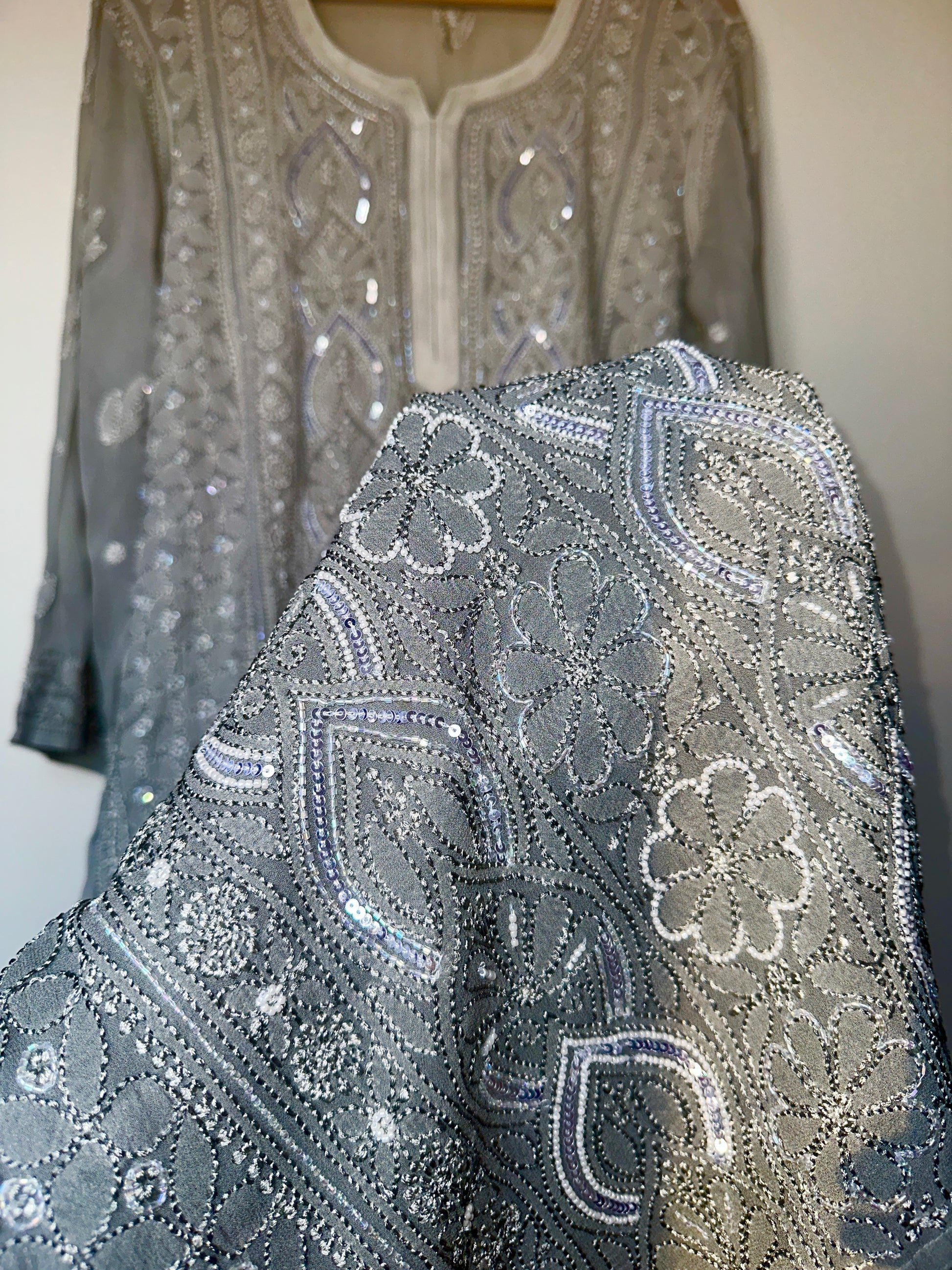 Viral Pearl Cutdana Chikankari Kurti - Ombré Grey